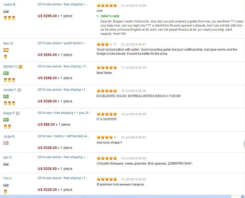 Мы высоко ценим ваше мнение и предложения как покупателя, мы сделаем все возможное, чтобы получить наиболее положительные отзывы. Если вам по какой-либо причине не нравится моя гитара, пожалуйста, не стесняйтесь прислать мне ваши отзывы, я буду очень благодарен! Пожалуйста, свяжитесь со мной непосредственно перед тем, как оставить отзывы в хорошем или отрицательном состоянии!