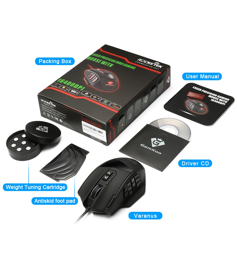 Игровая мышь Rocketek Venus MMO оснащена высокоточным лазерным сенсором 16400 dpi, который переключает баланс между клавиатурой и мышью с помощью 19 оптимизированных MMO кнопок, а также 5 сохраняемых профилей памяти и набор для настройки веса из 8 частей.