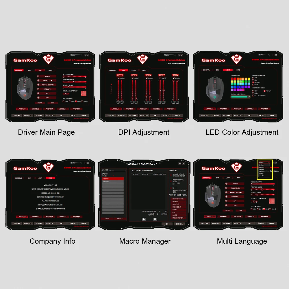 2,18 программируемых кнопок, 5 сохраняемых профилей памяти, каждый из которых имеет четкий светильник для быстрой идентификации, набор для настройки веса из 8 частей (2,4 г x8) и более 16 миллионов светодиодный вариантов цвета. Светодиодный, возможно, светодиодный, согласно вашим предпочтениям.