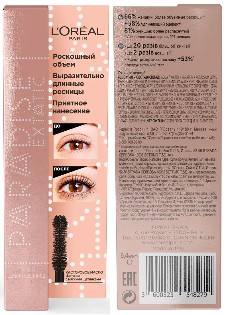 L'Oreal Paris Тушь для ресниц "Paradise Extatic" для объема и подкручивания ресниц, с касторовым маслом, 6,4 мл