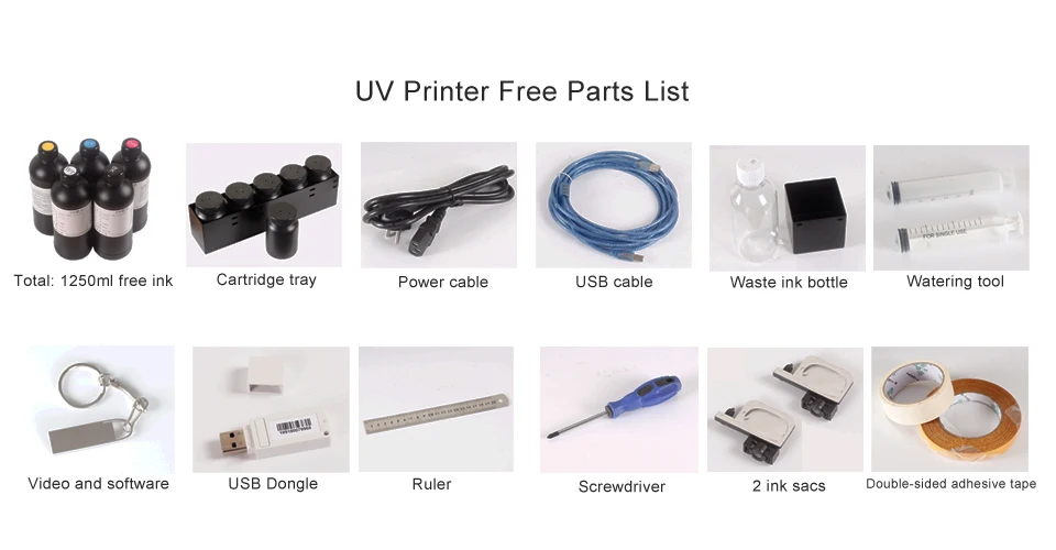 Упаковочный лист:1 Набор А4 УФ-принтер (автоматическая платформа) (модель: A4-6N-UV)5 бутылок свободных чернил (CMYK + W, всего 1250 мл)1 набор программного обеспечения для печати ACRORIP9.0.3-Special color separation.На изображении ниже показано, что есть Бесплатные гаджеты.