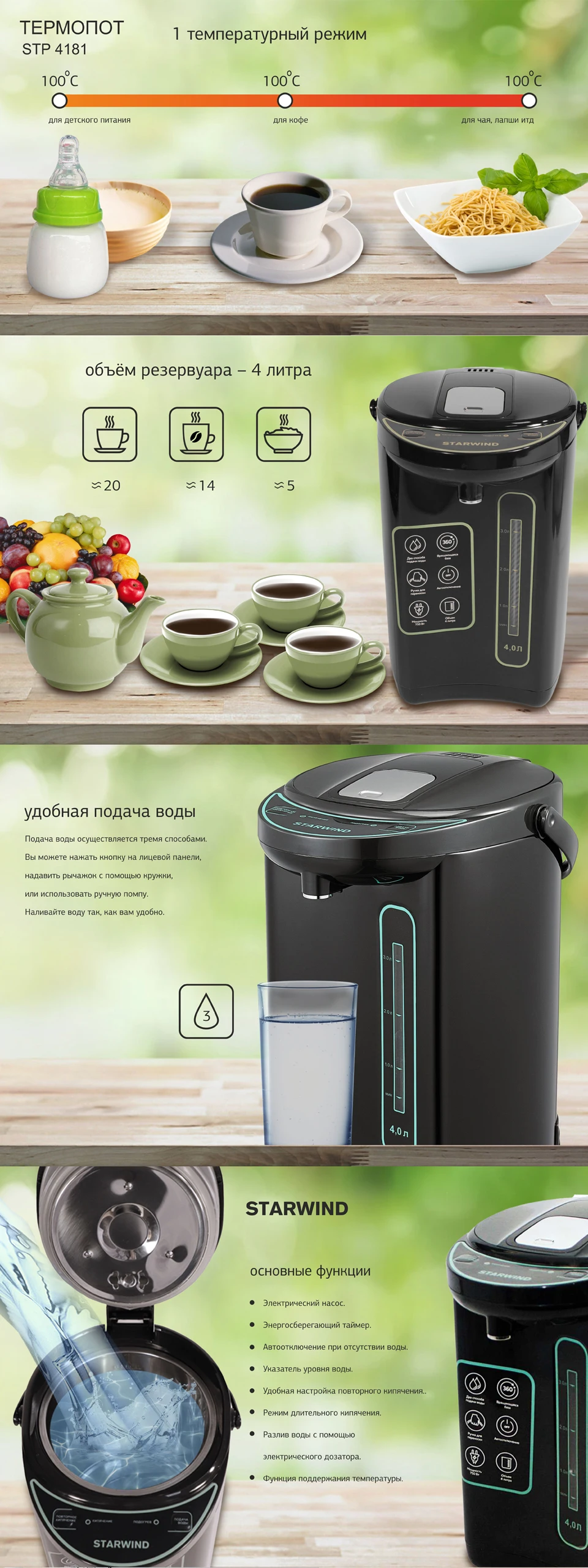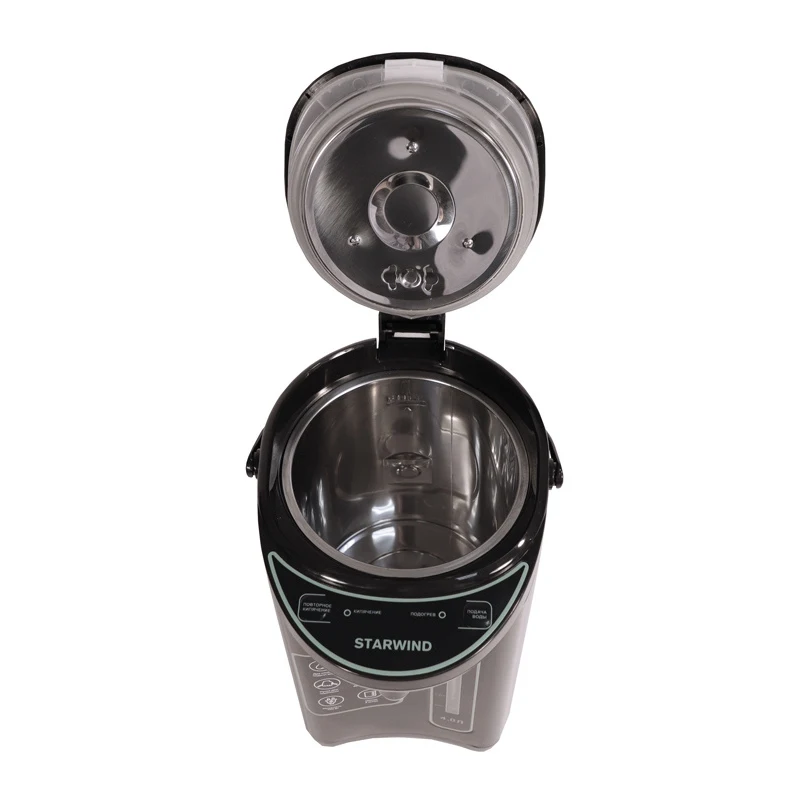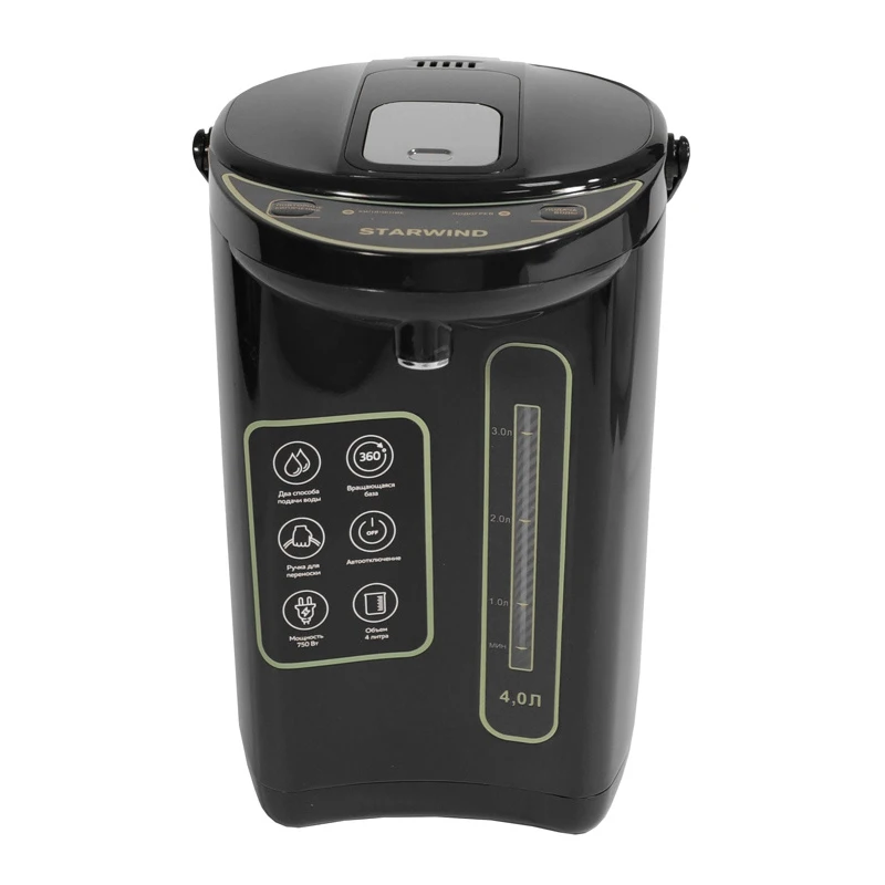 Термопот имеет четырехлитровый внутренний резервуар. Мощность скрытого нагревательного элемента - 750 Вт. Прибор оснащен удобной ручкой для переноски, которая находится в крышке.