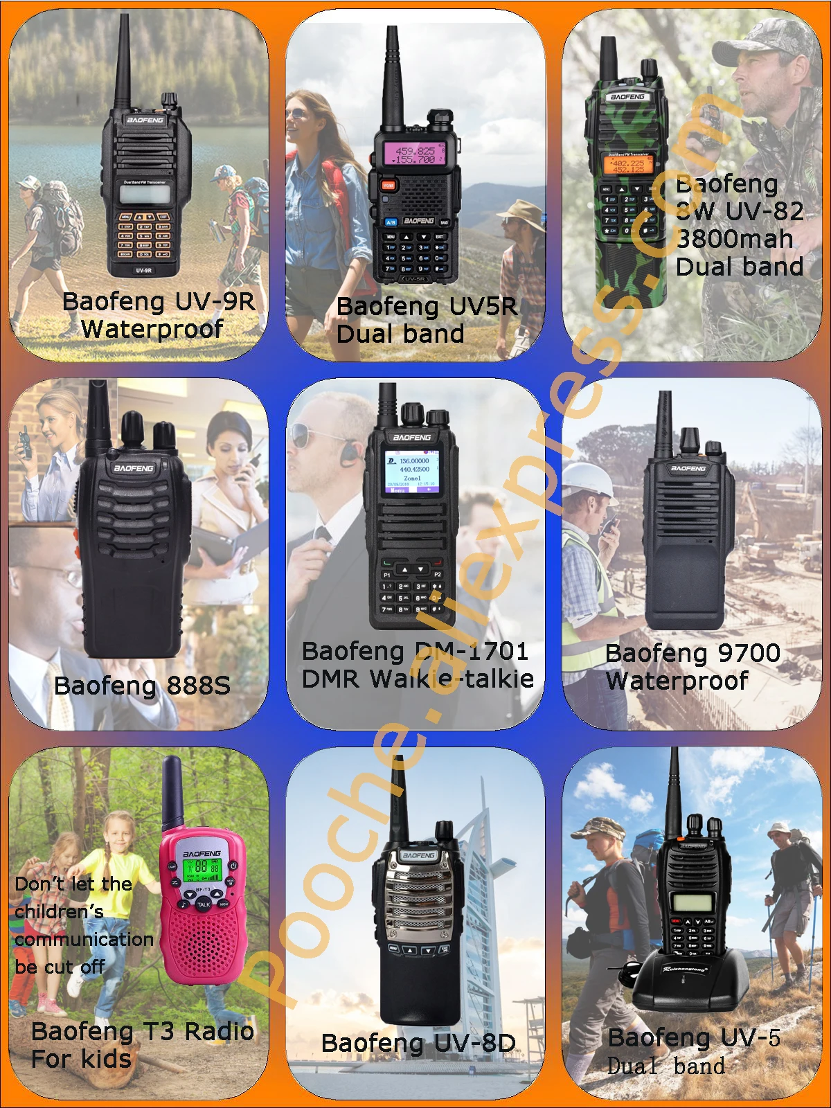 2 Вт рация: BF-S88 5 Вт рация: BF-888S, UV-6R; 8 Вт рация: UV-5R, UV-82 10 Вт рация: S-56 Мини-рация: BF-T3 Водонепроницаемая рация: Baofeng 9R Рация ПМР: DM-1701, DM-1702 Антенна рации: UT-108; UT-106 Зажим для ремня рации: 888S; 5R; UV-82 Walkie talkie airtube наушники: для Baofeng Рация микрофон динамик: для baofeng Аккумулятор рации: 5R; UV-82; 1800 мАч; 3800 мАч Рация muti-зарядное устройство: 5R; 888S; 777S; 666S; 5RA;5RE...