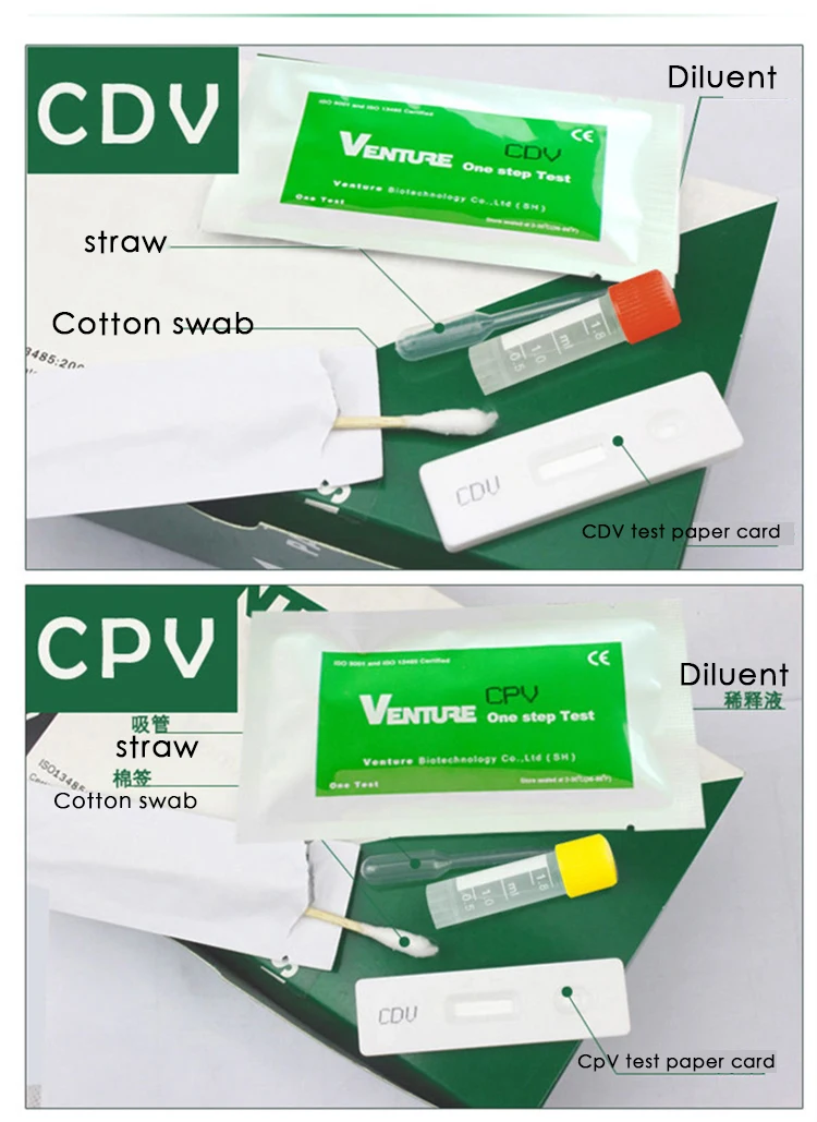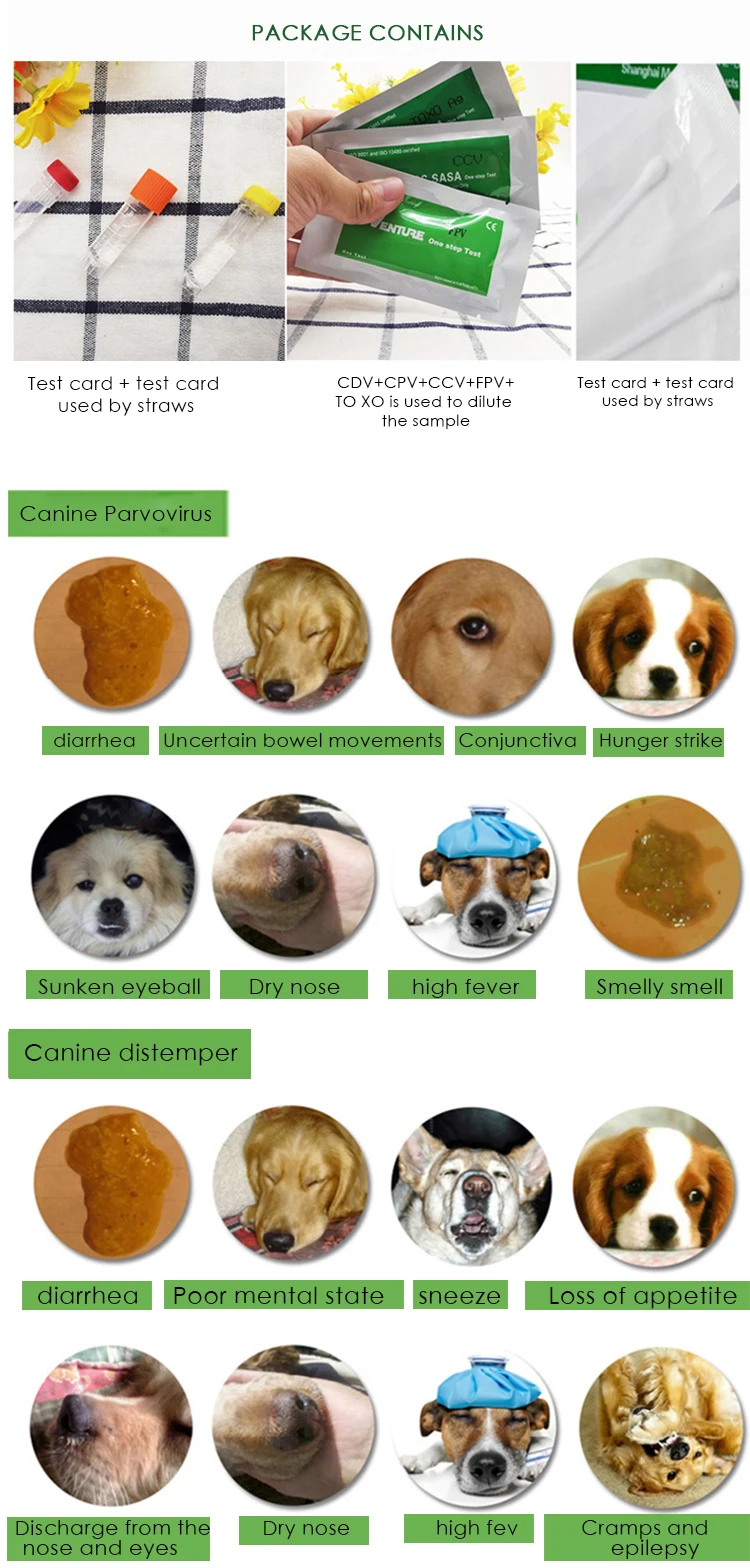 [Наименование] CDV Canine Disease FPV Feline Disease CPV Minor Disease CCV-GZ CO Toxoplasma CE [Применимо] общие для собак и кошек (см. Спецификации для использования объектов) [Действительность] для получения подробной информации, пожалуйста, обратитесь к соответствующей одиночной тестовой бумаге струйной печати, включая: 1 CDV собачья искривляющая тестовая карта (одноразовая соломка и осушитель) 1 CPV маленькая тестовая карта для собаки (одноразовая соломка и осушитель) 1 копия CCV dog GZ тестовая карта (одноразовая соломка и осушитель) 1 FPV тест-карта с котом чумой (одноразовая соломка и осушитель) 1 часть в XO (одноразовая соломка и осушитель) Каждая часть содержит 1 пробный тампон и 1 разбавляющий флакон [Наименование] CDV Canine Disease FPV Cat Disease CPV Minor Disease CCV-GZ CO Toxoplasma CE [Применимо] общие для собак и кошек (см. Спецификации для использования объектов) [Срок действия] для получения подробной информации, пожалуйста, обратитесь к соответствующей индивидуальной тестовой бумаге струйной печати, включая: 1 CDV собачья искривляющая тестовая карта (одноразовая соломка и осушитель) 1 CPV маленькая тестовая карта для собаки (одноразовая соломка и осушитель) 1 копия CCV dog GZ тестовая карта (одноразовая соломка и осушитель) 1 FPV тест-карта с котом чумой (одноразовая соломка и осушитель) 1 часть в XO (одноразовая соломка и осушитель) Каждая часть содержит 1 пробный тампон и 1 разбавляющий флакон CDV симптомы Первые симптомы: Температура выше 40 ℃, потеря аппетита, депрессия, водянистые выделения из носа и глаз, Чихание, диареи. После вялости, слабости и многократной рвоты стул меняется от мухи, полу-муши до воды. CPV в основном заражает собак, особенно щенков, которые чрезвычайно заразны и имеют высокий уровень летальности. Инкубационный период 1-8 дней CPV мелкие болезни симптомы Первые симптомы: Температура выше 40 ℃, похожая на острый гастроэнтерит, рвоту, диарею и кровь в стуле. Снижение аппетита и депрессии. Болезни могут возникать в течение всего года. Основным источником инфекции являются рвота, слюна и фекалии. Простота в эксплуатации Шаг 1: сбор образцов (Только немного для каждого собранного образца, не так много нужно!) Ватные тампоны собирают выделения глаз, носа, слюны и мочи Ватные тампоны для сбора фекалий собаки или кошки Шаг 2: разбавление образца Собранный образец помещается в разбавляющую бутылку и перемешивается и оседает. Образец для перемешивания Шаг 3: пипетка Используйте соломинку, чтобы впитать верхнюю прозрачную жидкость в бутылке разбавителя. Образец для перемешивания и аспирация Шаг 4: Поместите в отверстие S Отсасывайте жидкость для образца и поместите ее в отверстие для тест-карты и оцените результат в течение 5-10 минут Зайдите в течение 5-10 минут, чтобы определить результат Шаг 5: решение о результатах Инфекции И линия C, и линия T являются положительными, инфицированы собачьей чумой или малыми. На линии C есть светильник с красной линией и светильник с красной линией на линии T, что указывает на слабый ян, который может или не может быть изменен. Не инфицированных Отрицательный: только линия C, что указывает на отсутствие инфекции Недопустимый обнаружения Нет линии C и T, что указывает на недопустимость Недопустима только линия T Меры предосторожности 1. После того, как тестовая карта не запечатана, рекомендуется использовать ее в течение 5 минут. 2. Если печать сломана, тестовая карта может