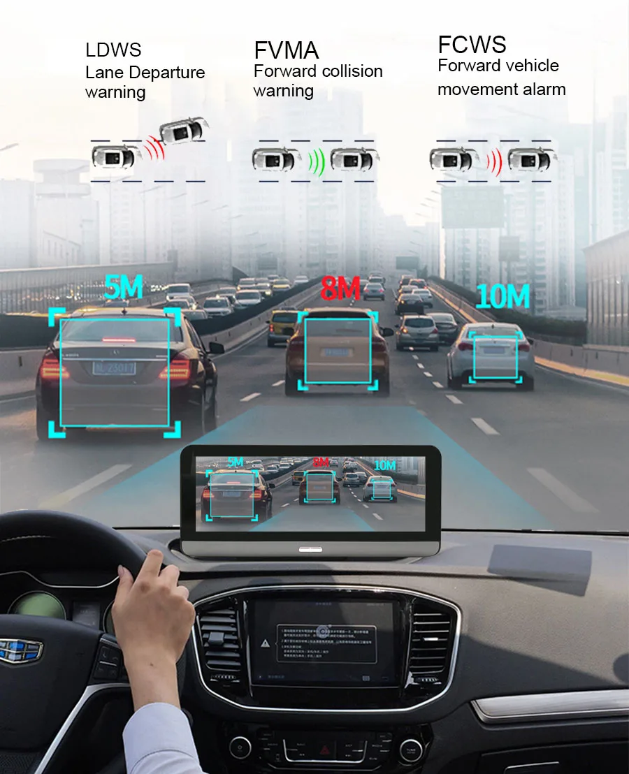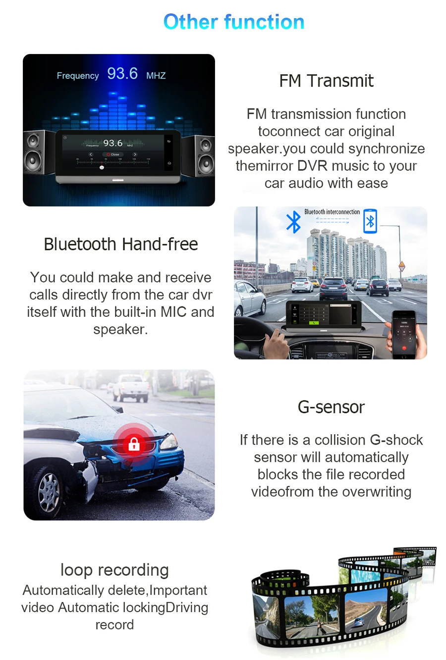 GPS навигация, Автомобильный видеорегистратор, монитор парковки, Bluetooth hands-free, WiFi, fm-передатчик, смарт-устройство с ОС Android 8,1, ADAS,4G интернет-серфинга, удаленный монитор, g-сенсор.