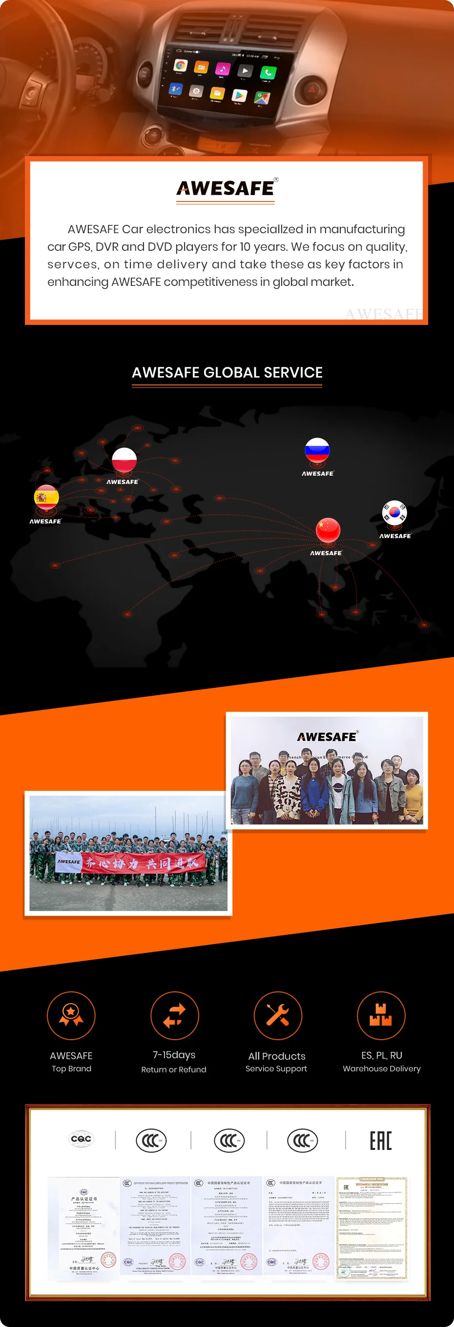 > 9 дюймов 2.5D емкостный Экран + 4 ядра 1,2 ГГц Процессор + DDR3 1 ГБ/2 ГБ/4 ГБ флэш-памяти (опционально) + 16 Гб/32 ГБ/64 Гб памяти (опционально) + встроенный Wifi (4G сеть опционально) + gps-навигация (Бесплатное обновление карты) + управление рулевым колесом + зеркальная связь + Bluetooth + Встроенный микрофон + FM/AM + RDS + Поддержка USB DVR ADAS + Поддержка Европейской DAB функции + 1080P видео воспроизведение + HD 1024*600 + Поддержка контроля давления в шинах Система > OSD язык Русский, английский, испанский, итальянский, французский, немецкий, китайский, эстонский, польский, филиппинский, финский, корейский, голландский, хорватский, латышский, литовский, румынский, норвежский, португальский, японский, шведский, тайский, турецкий, украинский, венгерский. > 7*24 часов обслуживания В Awesafe наша миссия упорно работает, чтобы предоставить вам надежный и замечательный Автомобильный мультимедийный плеер/автомобильное радио, инновационное оборудование и программное обеспечение, а также бесплатные обновления для прошивки, программного обеспечения, GPS навигационные карты.