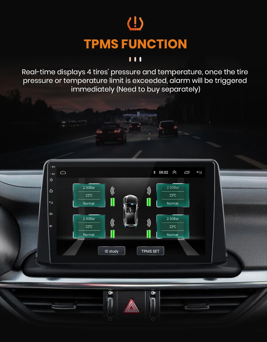 > Отображает 4 давления и температуры в режиме реального времени. Как только давление или температура в шинах будут необычными, сразу же будет сигнал тревоги.