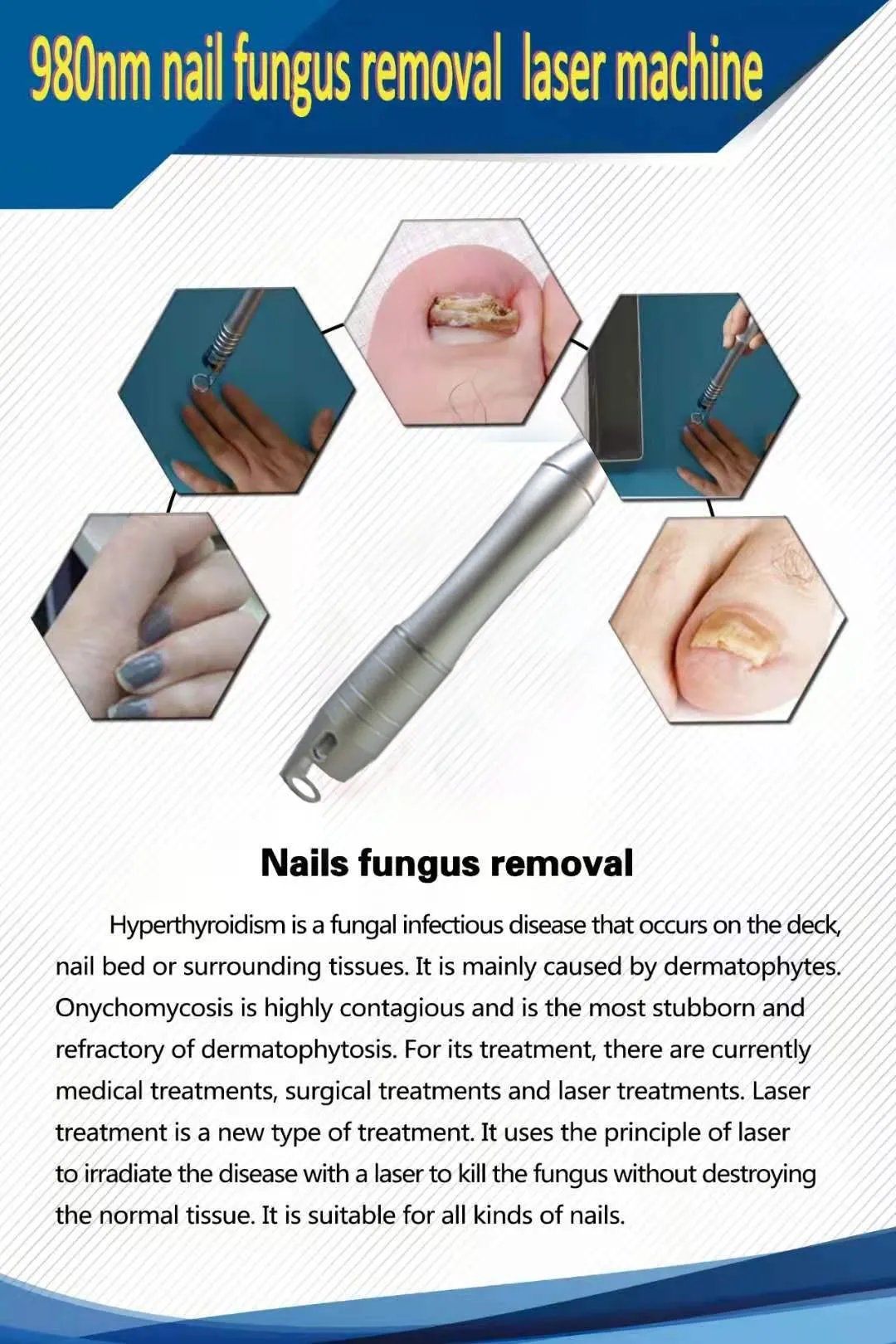 Онихомикоз относится к грибковым инфекционным заболеваниям, которые возникают на палубе, ногтевом ложе или окружающих тканях, в основном вызванным дерматофитами, которые характеризуются изменениями цвета, формы и текстуры. Лазерный зольный гвоздь-новый тип лечения. Он использует принцип лазера для облучения заболевания лазером, чтобы убить грибок, не разрушая нормальную ткань. Безопасен, безболезненен и не имеет побочных эффектов. Подходит для всех видов применения. Ситуация с онихомикозом.