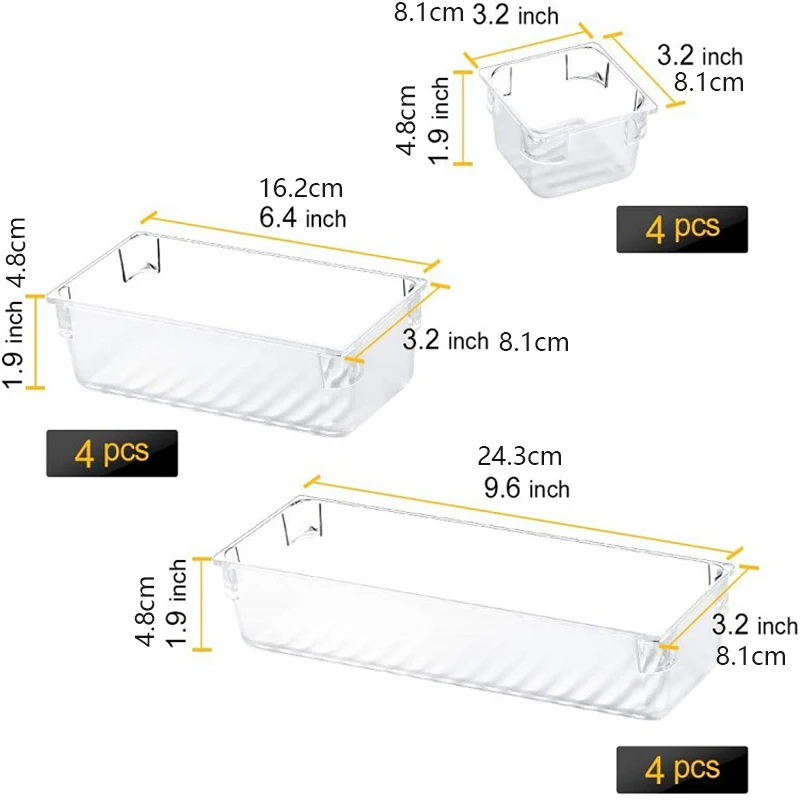 Бесконечные конфигурации: наш Набор ящиков-органайзеров имеет 4 ящика разного размера, которые вы можете настроить макет, чтобы соответствовать любому ящику размера или определенной потребности, такие как макияж/ванная комната/офис/кухня/туалетный столик, держать ваш ящик аккуратным и организованным.