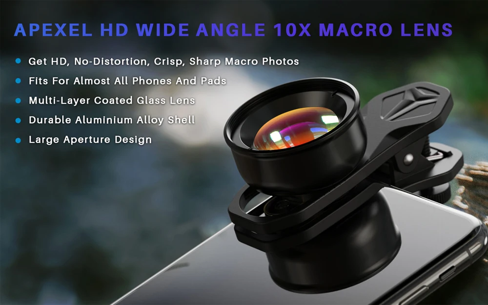 # APEXEL HD широкоугольный 10X макрообъектив #Получить HD, без искажений, четкие, четкие макрофотографииПодходит практически для всех телефонов и подушечекМногослойные Стеклянные линзы с покрытиемПрочный корпус из алюминиевого сплаваБольшая диафрагма