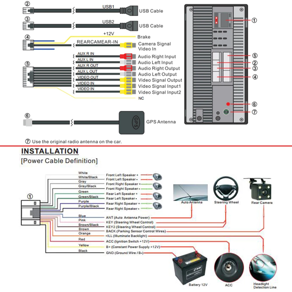 Feature: 1. FM radio 2. Support reading U disks (audio / video / picture) 3. Bluetooth function 4. RCA audio output can be connected to a subwoofer 5. Rear view function 6. Video input function 7. Learning function of original car steering wheel 8. Android dashcam input function 9. WIFI Internet access 10. GPS navigation 11. Phone connectivity (for Android / for iOS) 12. APP can be installed 13. With frame, better installation effect Specification: Model: 9210S Voltage: 12V OS: Android 10.1 Memory: 1GB+16GB (system will occupy some memory) Software solution: MTK Screen size: 7 inches HD Screen resolution: 1024*600 Panel size: 178*102mm/7.01*4.02" Button light: white Packing size: 200*113*170mm/7.87*4.45*6.69" (kraft box) Depth: 55mm/2.17" Weight: 892g Phone connectivity: support, for iOS/Android GPS navigation: support Radio band: FM Radio chip: QN8035 Language: Indonesian / Malay / Czech / Danish / German / English / Spanish / Filipino / French / Croatian / Italian / Latvian / Lithuanian / Hungarian / Dutch / Norwegian Bokmal / Polish / Portuguese / Romanian / Slovak / Finnish / Swedish / Vietnamese / Turkish / Greek / Bulgarian / Russian / Ukrainian / Hebrew / Urdu / Arabic / Persian / Hindi / Bengali / Thai / Khmer / Korean / Chinese / Traditional Chinese / Japanese Power: 60W Working temperature: -10 ~ +60 degrees Reversing image: support Brake prompt function: support Steering wheel control function: Support Bluetooth model: Version 4.0 Amplifier chip: TDA7388 Radio frequency: FM 87.5 ~ 108MHz Video output: Yes Screen mirroring: support Built-in offline map: Yes Wireless WIFI: support TF card slot: No GPS slot: No Remote control: No Steering wheel control: No USB interface and version: USB2.0 Reset button: Yes Button: touch buttons RCA terminals: 2 audio outputs, 2 audio inputs, 2 video inputs, 1 reversing input, 1 video output Front aux audio input: No DVR function: Support DAB function: No OBD function: No TV function: No DVD movement model: No 4G / 3G: No Car logo replacement: support Supported audio formats: MP3 / WMA / WAV / APE / FLAC Supported video formats: RM / RMVB / AVI / MP4 / MKV / 3GP Supported picture formats: JPG 12 LED Rear view camera: Yes, No Notice: 1. Double sided design, two-way heat dissipation, more durable. 2. When using navigation function, you need to first locate, search for satellite, import maps for normal use. 3. As long as the car stereo's installation size and machine size match, it can be installed and used. 4. When installing the machine, be sure to connect the wire correctly. If the installation does not power on the machine, please connect the red wire and yellow wire to the 12V power supply positive pole, the black wire to the power supply negative pole, try to see if the machine can normally power on. If it can be powered on normally, then it may be due to the problem of wiring, you can ask for our help, so that you can use the product better. Note: 1. There may be slight size deviations due to manual measurement, different measuring methods and tools. 2. The picture may not reflect the actual color of the item because of different photographing light, angle and display monitor. 1 X Rear View Camera (Optional) 1 X Power Cord 2 X USB Cables 2 X RCA Terminal Cables 1 X GPS Antenna 1 Set X Screw + Bracket 1 X Instruction Manual