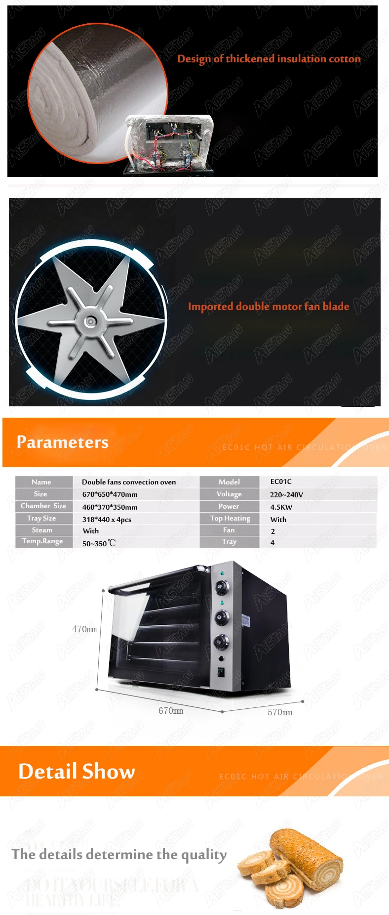Аппарат представляет собой электрическую печь из нержавеющей стали, которая имеет Четырехслойный противень для увеличения количества выпечки и свободно управляется от 0 до 350 °C. Также имеется устройство циркуляции горячего воздуха для предотвращения запекания. Машина подходит для выпечки яичных пирогов, тортов, хлеба, пиццы и других ингредиентов.