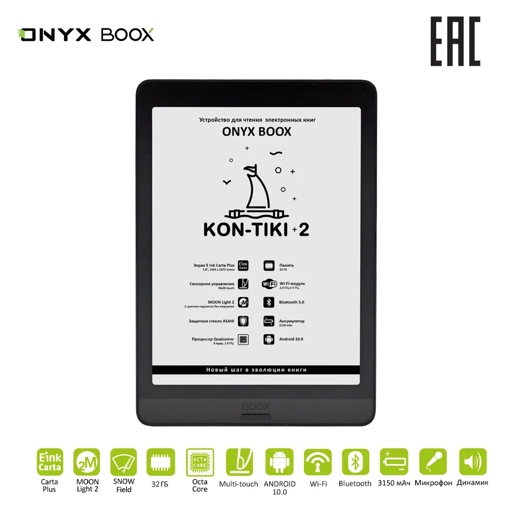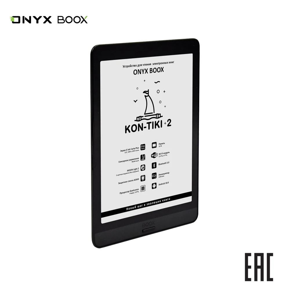ONYX BOOX KON-TIKI 2 — устройство для чтения электронных книг с увеличенным экраном и выдающимися техническими характеристиками. Модель имеет дисплей E Ink Carta Plus размером 7,8 дюйма с сенсорным управлением и подсветкой с цветовой регулировкой. Высокопроизводительный 8-ядерный процессор в сочетании с 3 ГБ оперативной памяти обеспечивают высокую скорость работы устройства даже со сложными документами. Благодаря большому экрану данная модель позволяет совмещать чтение художественной и технической литературы. Kon-Tiki 2 базируется на операционной системе Android 10.0, что позволяет использовать сторонние приложения и делает устройство более универсальным.