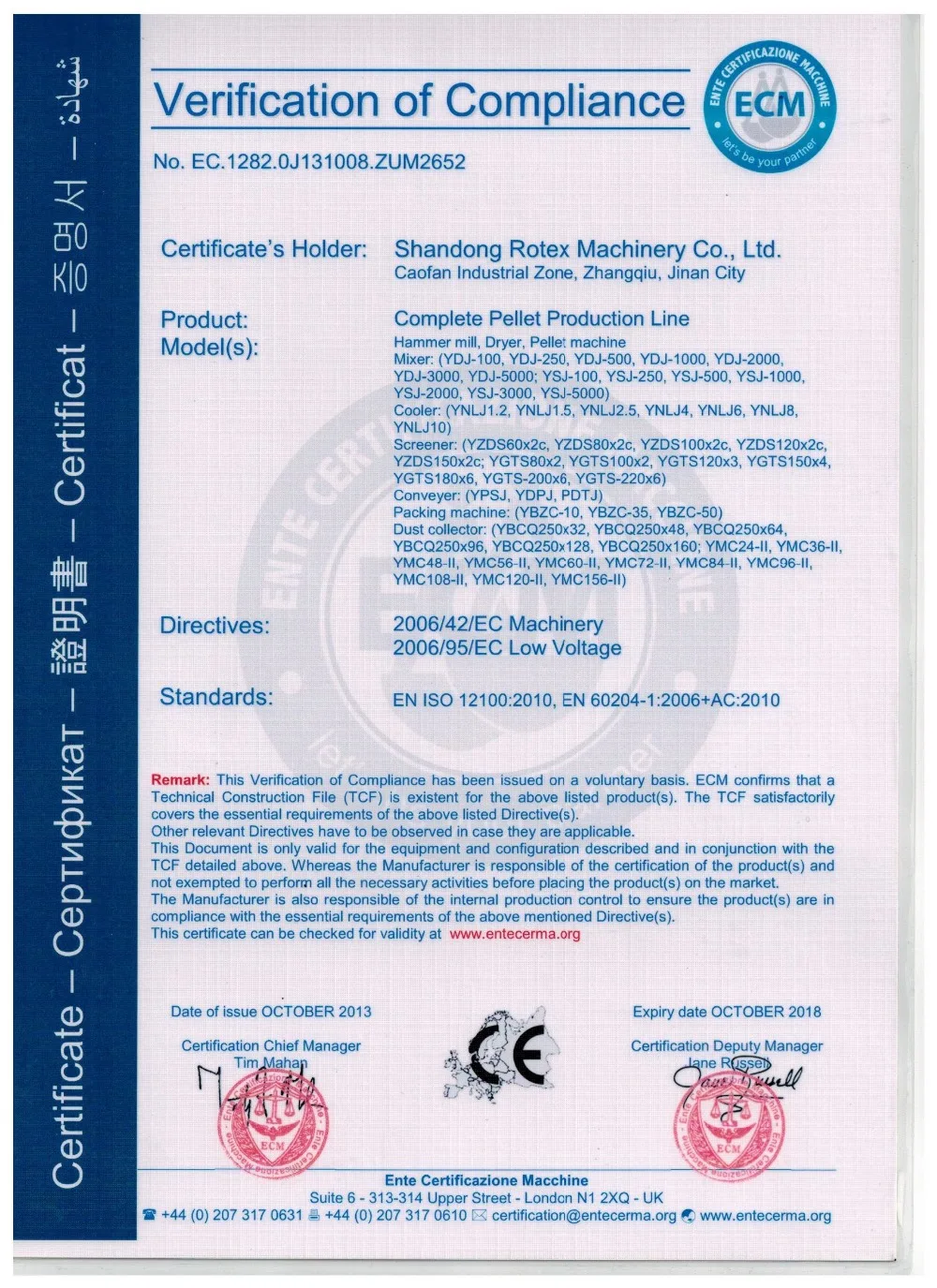 Сертификат машины для изготовления гранул