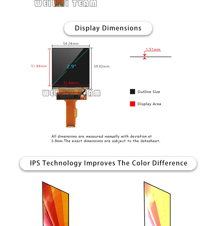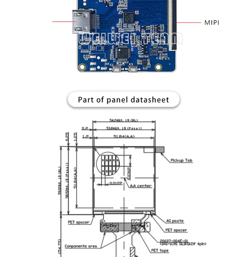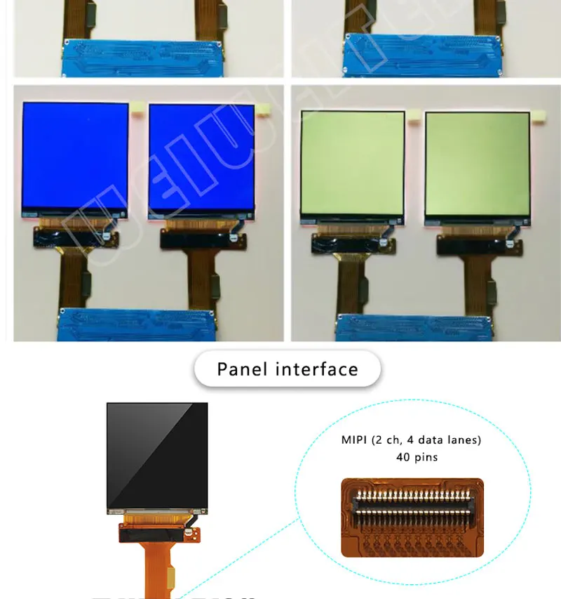 Display General Description: Panel Type :CG-Silicon,LCM Panel Size: 2.9 inch Resolution : 1440(RGB)×1440 Configuration : RGB Vertical Stripe Active Area : 51.84 (H) × 51.84 (V) mm Surface Outline Size : 54.24×59.02×1.51 mm(H×V×D) Contrast Ratio: 1100:1 (Typ.) (TM) Brightness: 300 cd/m⊃2; (Typ.) Display Mode : New Mode 2, Normally Black, Transmissive Viewing Angle: 80/80/80/80 (Min.)(CR≥10) Response Time : 10 (Typ.)(Tr+Td) ms Lamp Type: 4S2P WLED , W/O Driver Display Colors: 16.7M 70% (CIE1931) Signal Interface: MIPI (2 ch, 4 data lanes) , 40 pins, terminal Input Voltage : 1.8/5.5/-5.5V (Typ.)(VDDI/VSP/VSN) Environment Operating Temperature: -20 ~ 60 °C Storage Temperature: -30 ~ 70 °C