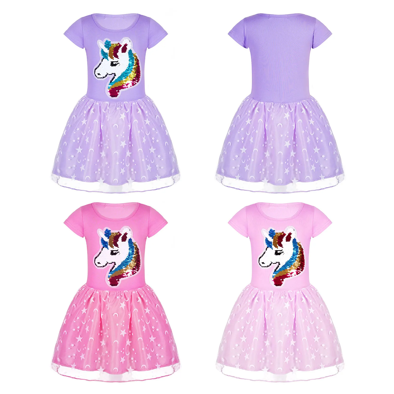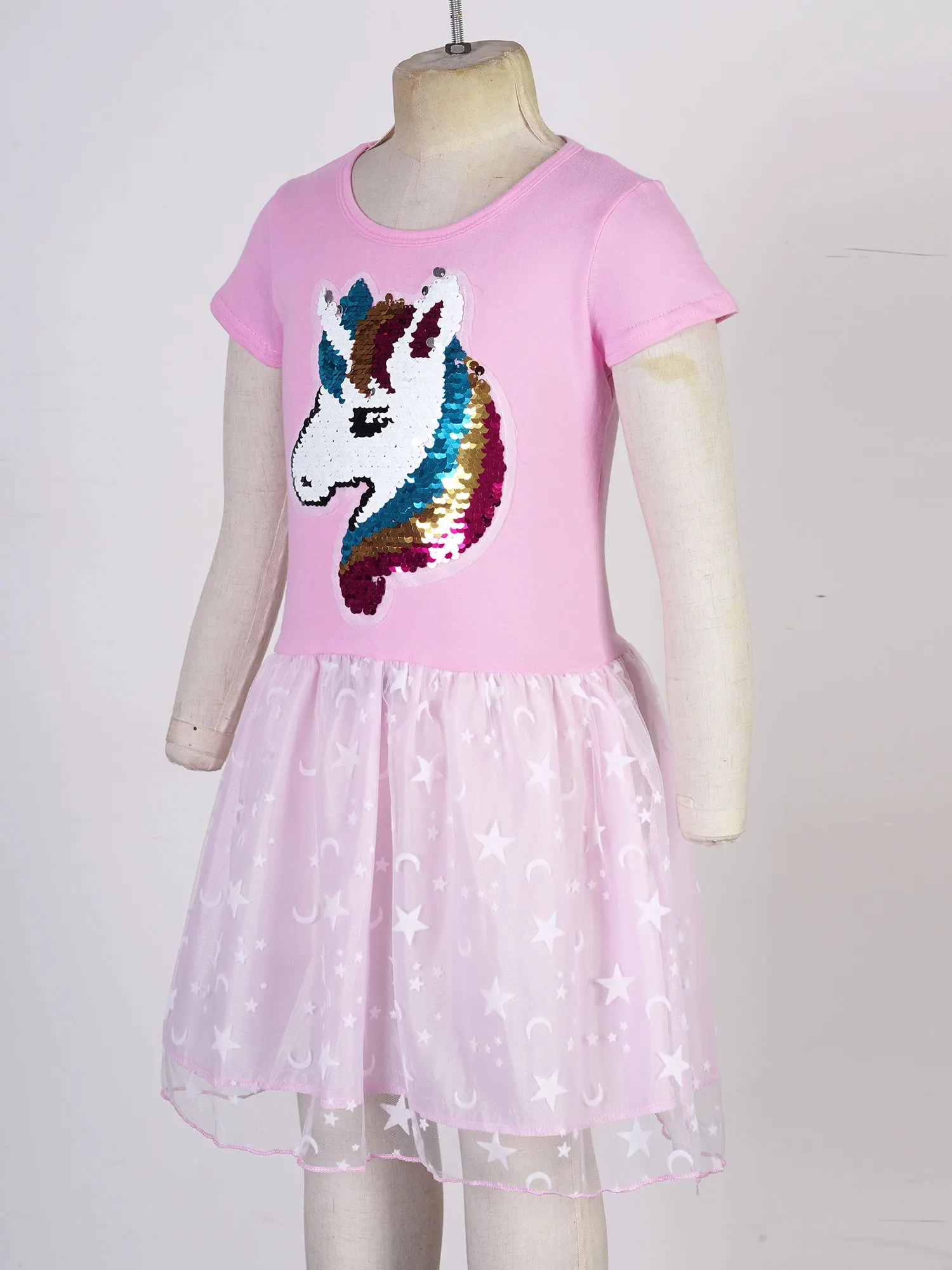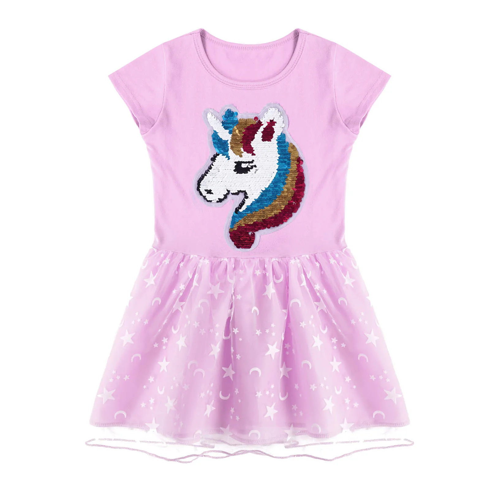 Детские платья для девочек ростом от 100 до 140 см, летнее повседневное Сетчатое платье трапециевидной формы с короткими рукавами с блестками и аппликацией в виде лошади, звезд и Луны