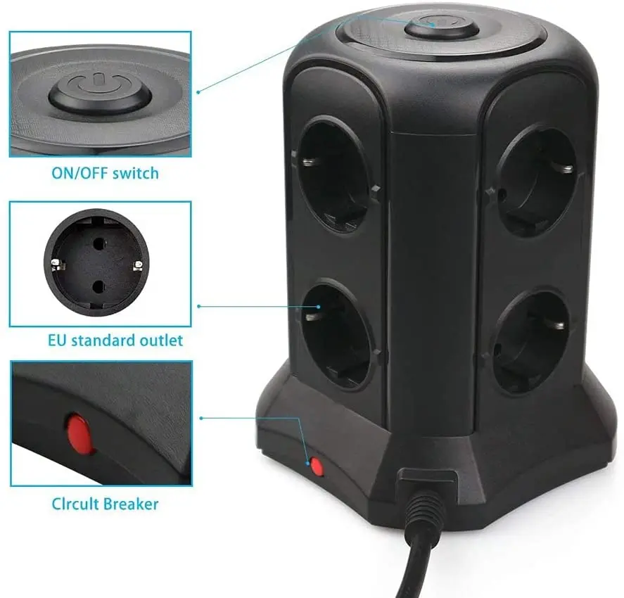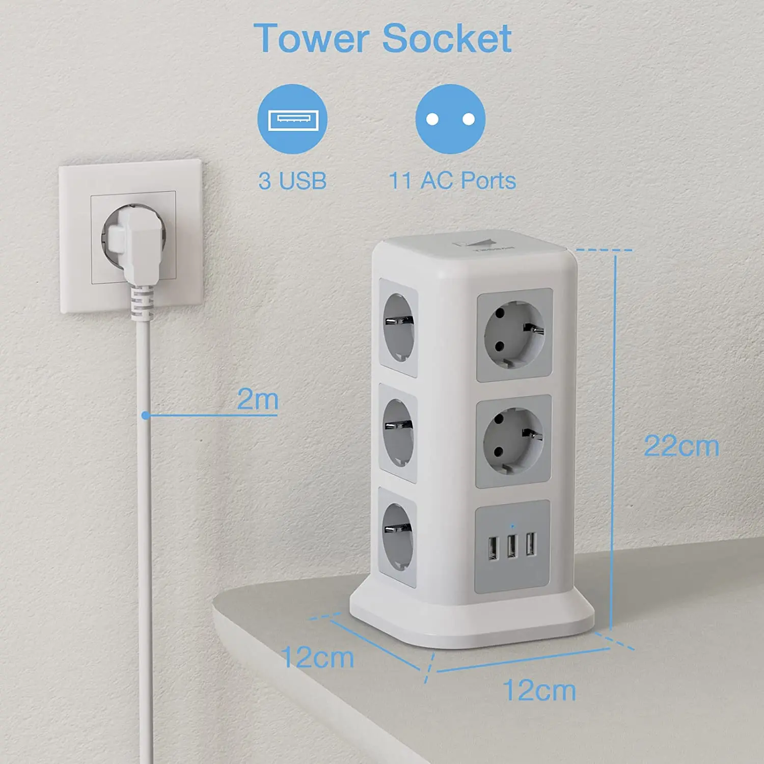 Эта полоса питания имеет конструкцию розетки башни. Компактный размер (16,1x11,4x11,4 см) с удлинителем 2 м, вы можете положить распределительную коробку в угол или на стол.