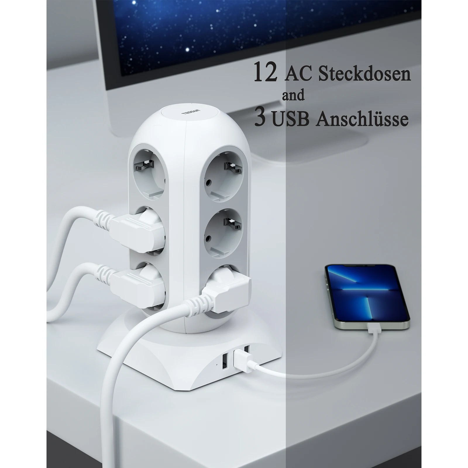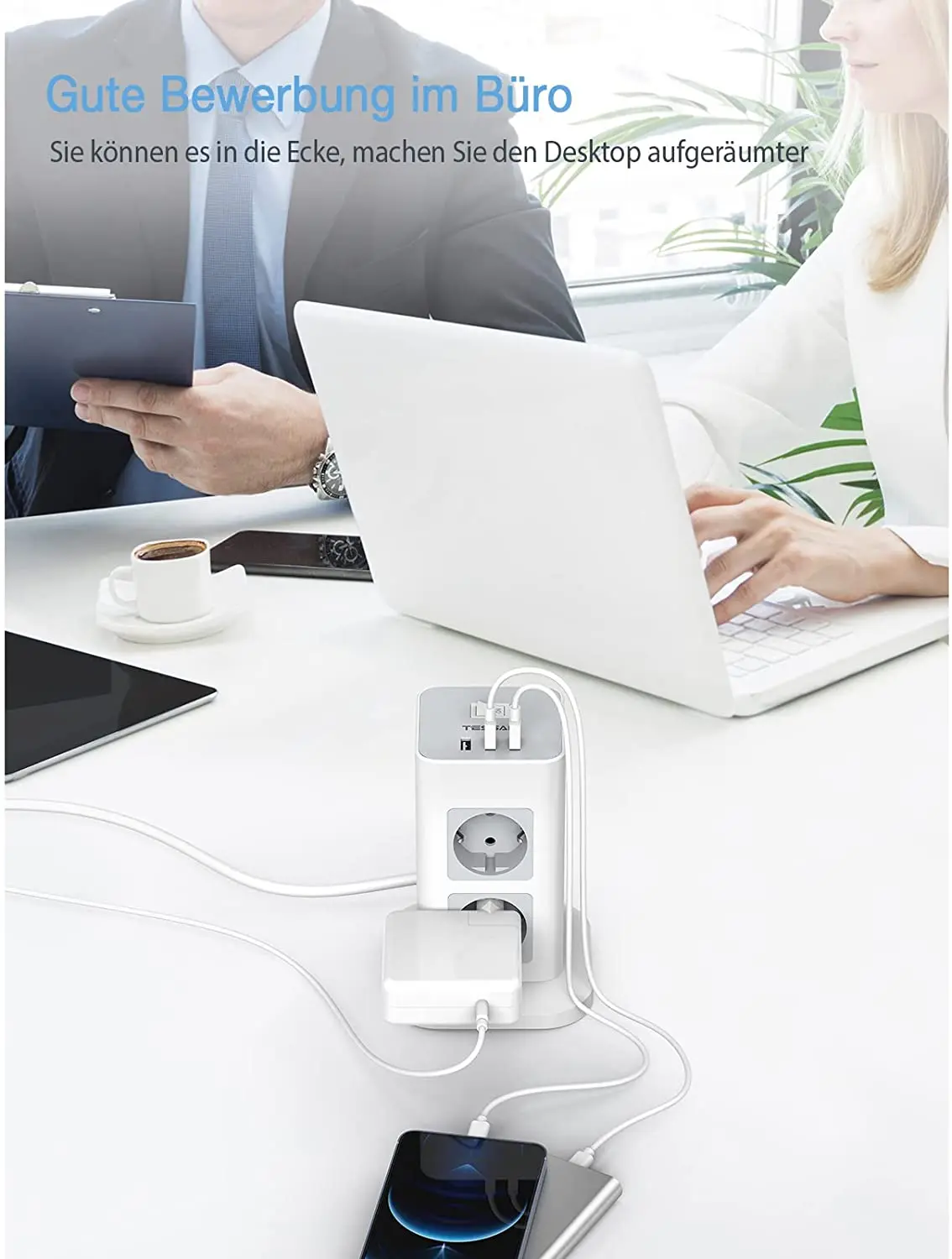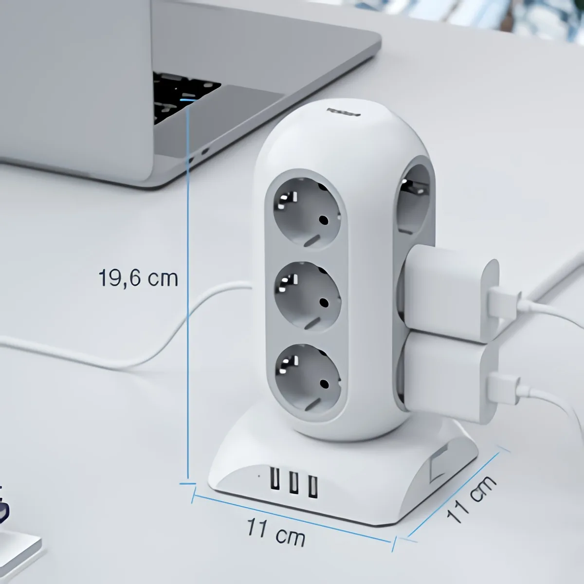 Несколько розеток с 8 гнездами вертикально расположены на 4 поверхностях, что экономит пространство, чем обычные несколько разъемов. Полоса питания с 3 USB покрывает потребности зарядки вашего домашнего офиса.