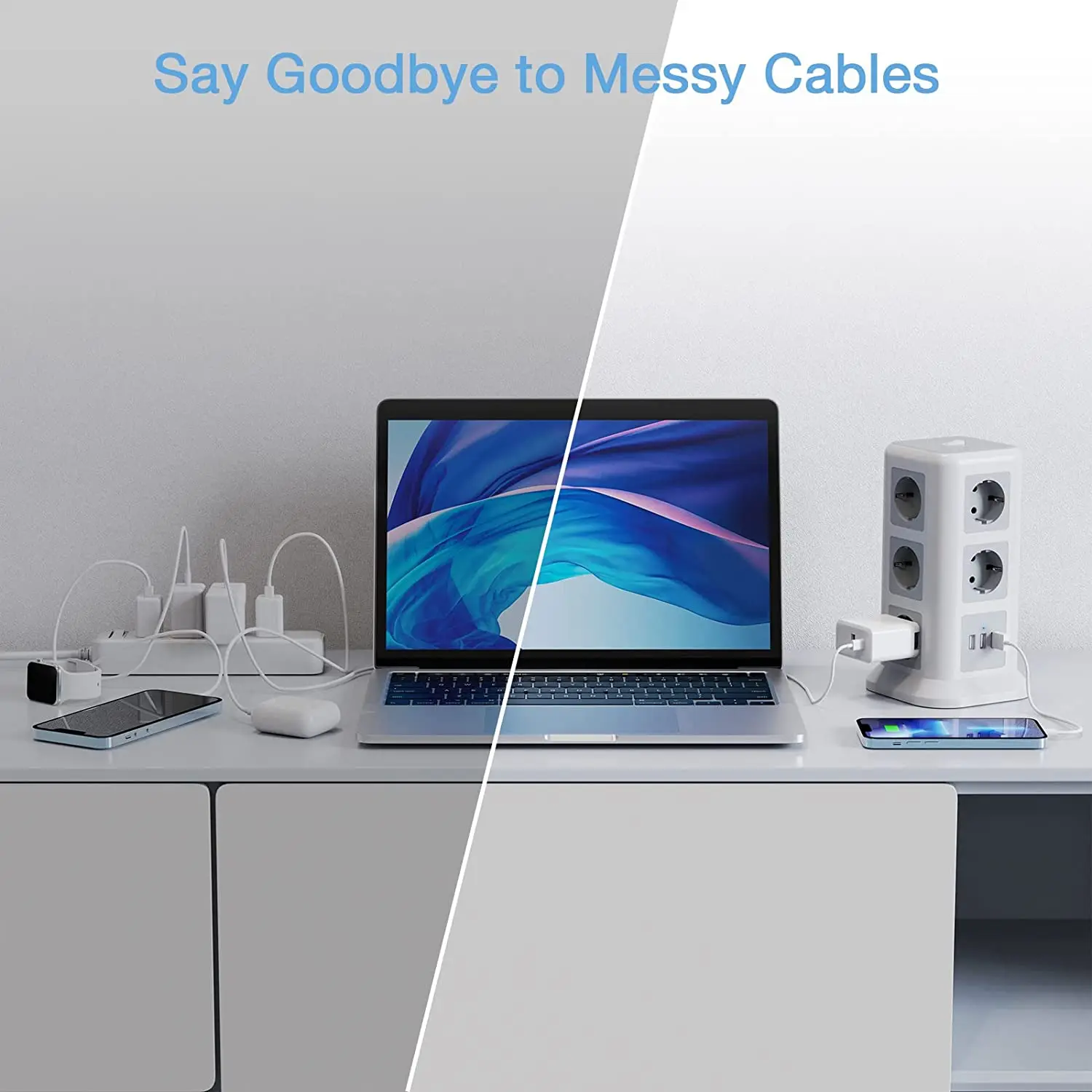 Благодаря дизайну башни, 12 штепсельных вилок многоконтактной башни распределяются вертикально с 4 Сторон. При зарядке нескольких устройств лента питания может эффективно организовывать шнуры, поэтому ваши шнуры больше не запутаны.