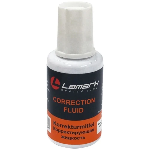 Корректирующая жидкость Lamark 20 мл на основе растворителя, с кистью, предназначена для корректировки всех типов документов, включая бумагу для факса, подходит для всех типов чернил. Корр.жидкость ложится ровным гладким слоем, создает непозрачное белое покрытие. Кисточка идеальна для аккуратного нанесения. Флакон снабжен шейкером.