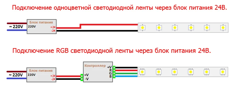 При подключении к блоку питания соблюдать полярность. Питание на ленту подавать на каждые 5 метров.