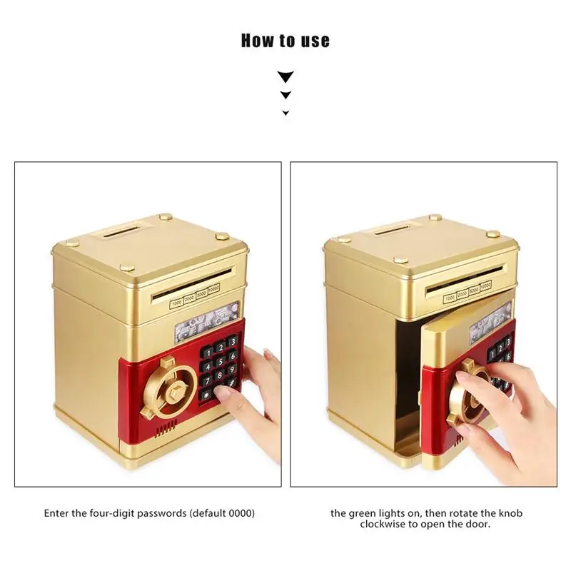 С паролем, голосом, в дополнение к экономии денег, а также для определения целей экономии, планирования финансовых расходов. Можно использовать для хранения игрушек, ювелирных изделий, банкнот и т. д. слот в слоте для монет может содержать монеты или бумажные деньги.