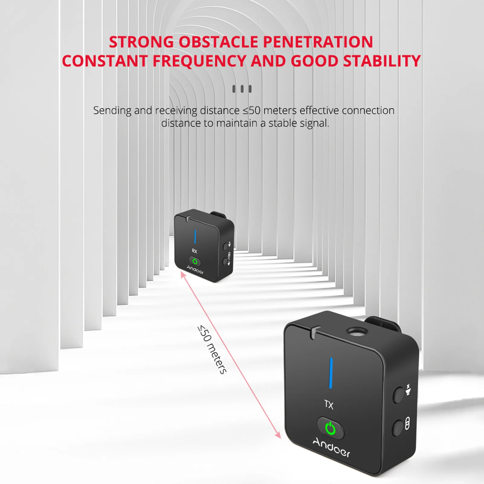 Этот беспроводной микрофон принимает Частотный диапазон 2,4G, имеет стабильную передачу сигнала и эффективный диапазон 50 м, не легко мешать, идеально подходит для записи фильмов и vlog, потоковой передачи, интервью и т. д.