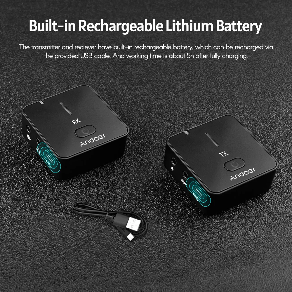 Передатчик и приемник имеют встроенную перезаряжаемую батарею, которая может заряжаться через предоставленные usb-кабели, и время работы до 5 часов после полной зарядки.