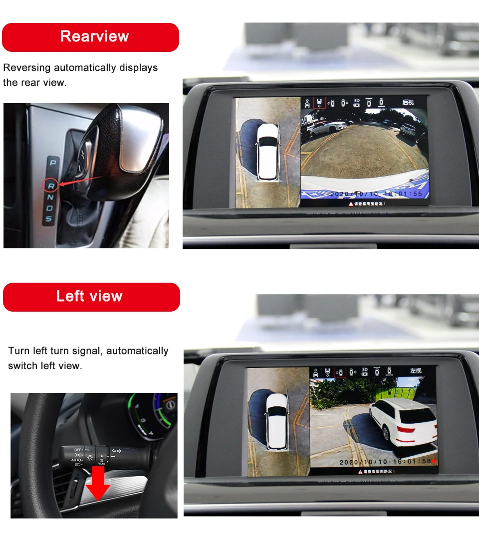Особенности и характеристики: Автомобильная 360 панорамная Система помощи при вождении и парковке с CCD качеством слева + справа + спереди + камера заднего вида Функции: Вид автомобиля: дисплей спереди/сзади/слева/справа четыре изображения камеры в quad-split Режим и начать запись. Левый поворот: отображение изображений в режиме трех разрезов с левым, передним и задним видом. Поворот вправо: отображение изображений в режиме трех разрезов с правой, передней и задней стороны. Реверсивный: дисплей камеры заднего вида и 360 вокруг панорамирования моделирования. Предупреждение льная лампа включается: отображение изображений в режиме трех разрезов с переднего, правого и левого вида. Остановка автомобиля: может установить 1-24 часа задержки записи после парковки автомобиля. (необходимо изготовить на заказ) Технические характеристики Язык работы: английский/китайский Интерфейс работы: графический интерфейс меню (экранное меню) для ИК-пульта дистанционного управления Видео вход: 4-канальный видео вход Видеовыход: Одноканальный композитный видеовыход Режим отображения: одиночная рамка/три кадра/четыре кадра дисплея Видео стандарт: NTSC/PAL Сжатие видео: Основной Профиль H.264 Режим записи: автоматическая запись/Обнаружение записи/ручная запись Канал записи: 4 канала (1-4 канала на выбор) Воспроизведение записей: Доступно Хранение данных: Поддержка sd-карты 8 ГБ ~ 32 Гб Обновление программного обеспечения: поддержка обновления SD Рабочее напряжение: 12 В постоянного тока Рабочий ток: 400 мА Рабочая температура: -20-80 °C Посылка Вес: 1205 г Размер коробки: 30*20*7,3 см