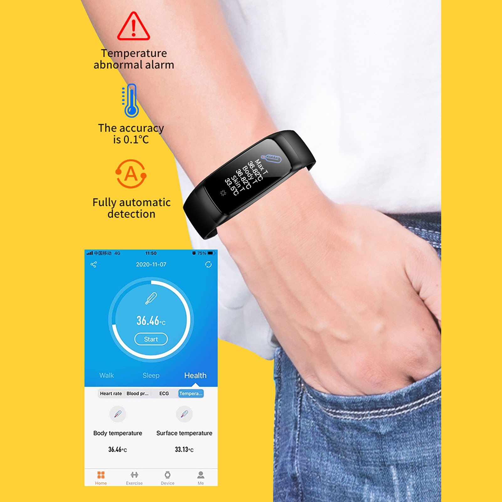 1. Температура тела автоматически Контролируется 24 часа в сутки, и данные о температуре тела синхронизируются с Фон приложения для просмотра в режиме реального времени