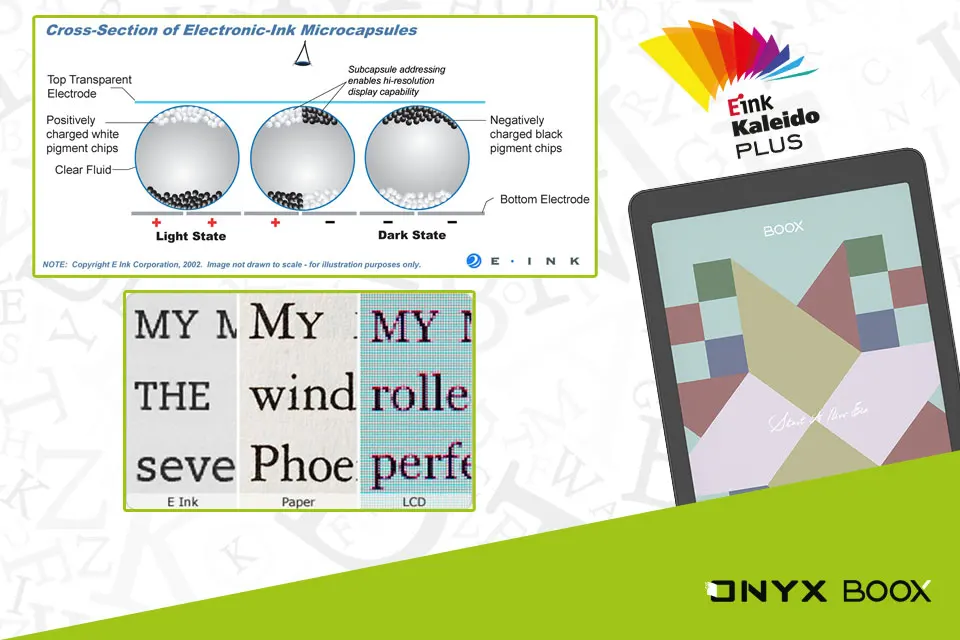 Экран E Ink Kaleido Plus позволяет отображать 4096 цветов. Благодаря возможности отображать палитру, на таком дисплее будет удобно читать учебную литературу и книги с иллюстрациями. Плотность пикселей составляет 300 ppi в чёрно-белом режиме и 100 точек на дюйм - в цветном режиме. Читать с такого экрана так же комфортно, как со страницы хорошей бумажной книги.