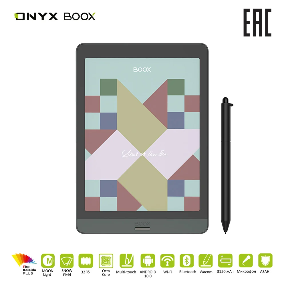 ONYX BOOX NOVA 3 Color — устройство с цветным экраном 7,8 дюйма E Ink Kaleido Plus с подсветкой и двойным сенсорным управлением. Благодаря увеличенному экрану, способности отображать цвета и возможности делать рукописные заметки данная модель станет идеальным выбором для тех, кто планирует совмещать чтение литературы, работу с документацией и просмотр комиксов. Ридер имеет компактный корпус толщиной всего 7,7 мм и при этом оснащён высокопроизводительным 8-ядерным процессором и модулями Wi-Fi и Bluetooth. Благодаря операционной системе Android 10.0, на которой базируется NOVA 3 Color, имеется возможность устанавливать на устройство различные сторонние приложения.