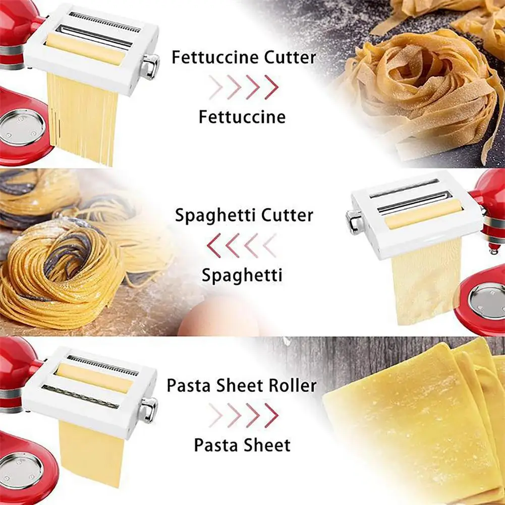 1. Специальный дизайн: кухонный смеситель для помощи. Включает в себя ПАСТА ТЕСТО РОЛИК, феттуксин резак и нож для спагетти. Скрутите тесто и нарежьте макароны на спагетти, феттуксин и лазанья одновременно, не нужно менять повязку на макароны.