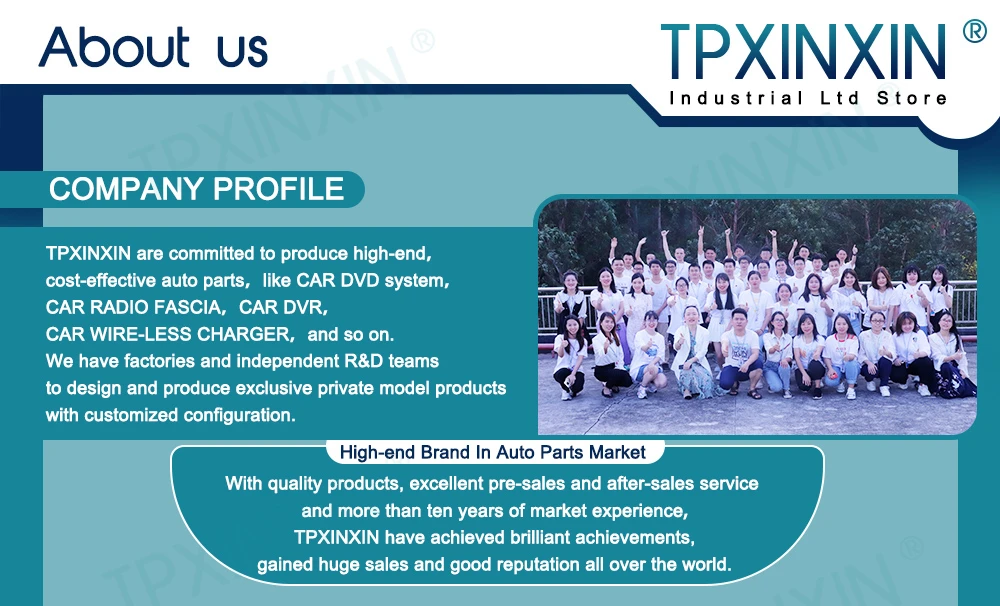 TPXINXIN стремится производить высококачественные, экономически эффективные автозапчасти, такие как автомобильная DVD система автомобильного радио фасции. Автомобильный видеорегистратор. Автомобильное беспроводное зарядное устройство. И так далее. У нас есть factoriesand независимые R & D команды для разработки и производства эксклюзивных частных модельных продуктов с индивидуальной конфигурацией.