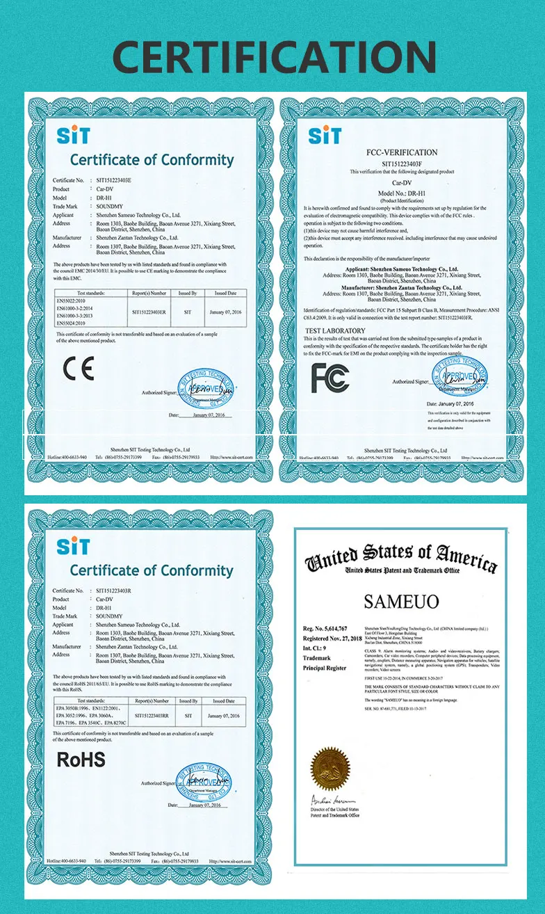 Sameuo Dash Cam соответствует примерно 95% автомобили на рынке по всему миру с Sameouo Dash Cam обеспечивают электростатического adhension установки. Однако некоторые модели не могут использовать питание из-за разницы в интерфейсе оригинальной автомобильной прикуривателя.