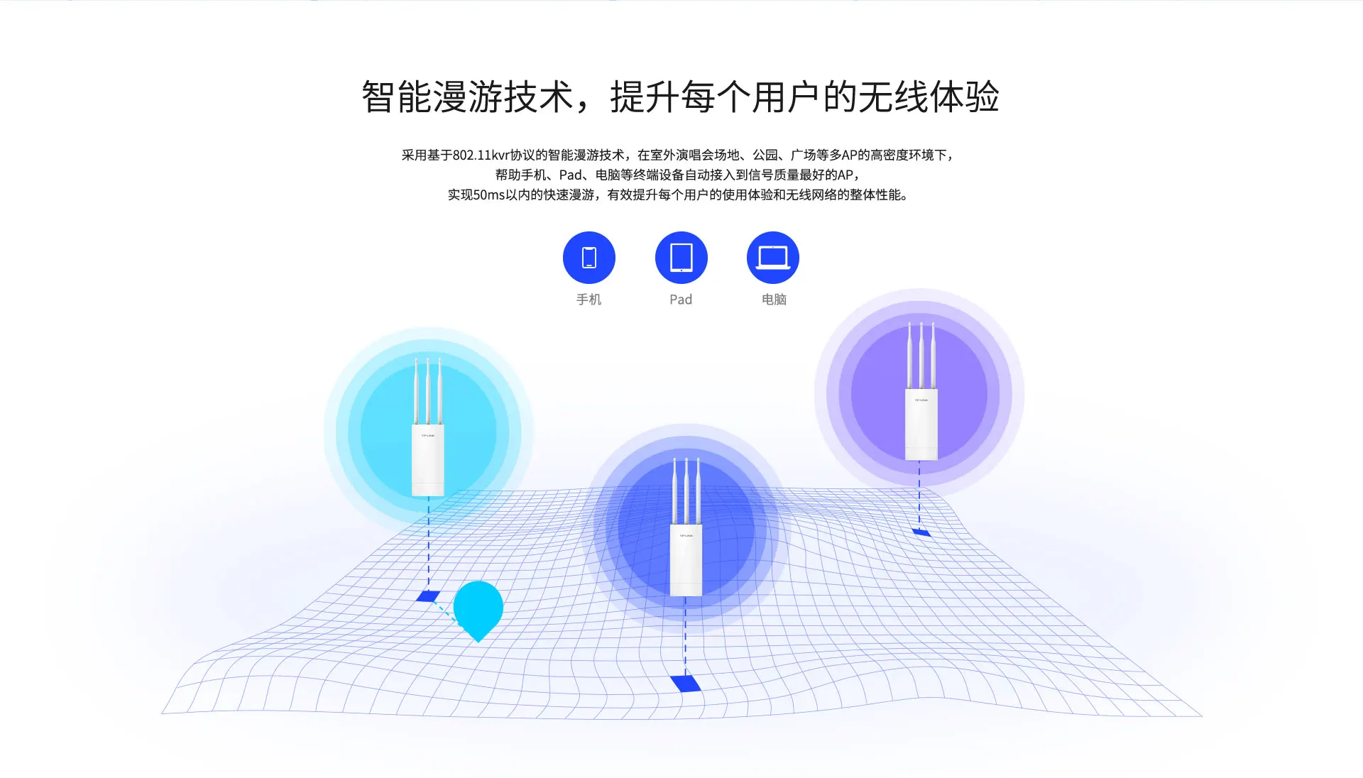 > Интеллектуальная технология роуминга для улучшения беспроводного опыта каждого пользователя. Использование технологии smart roaming на основе протокола 802.11kv помогает мобильным телефонам, подушечкам, компьютеры и другие терминальные устройства в условиях высокой плотности с несколькими AP, такими как конференц-залы/Офисные зоны/бары/KTVs, автоматически подключаются к AP с лучшим качеством сигнала, обеспечивает быстрый роуминг в пределах 50 мс, И эффективно улучшает пользовательский опыт каждого пользователя и общую производительность беспроводной сети.