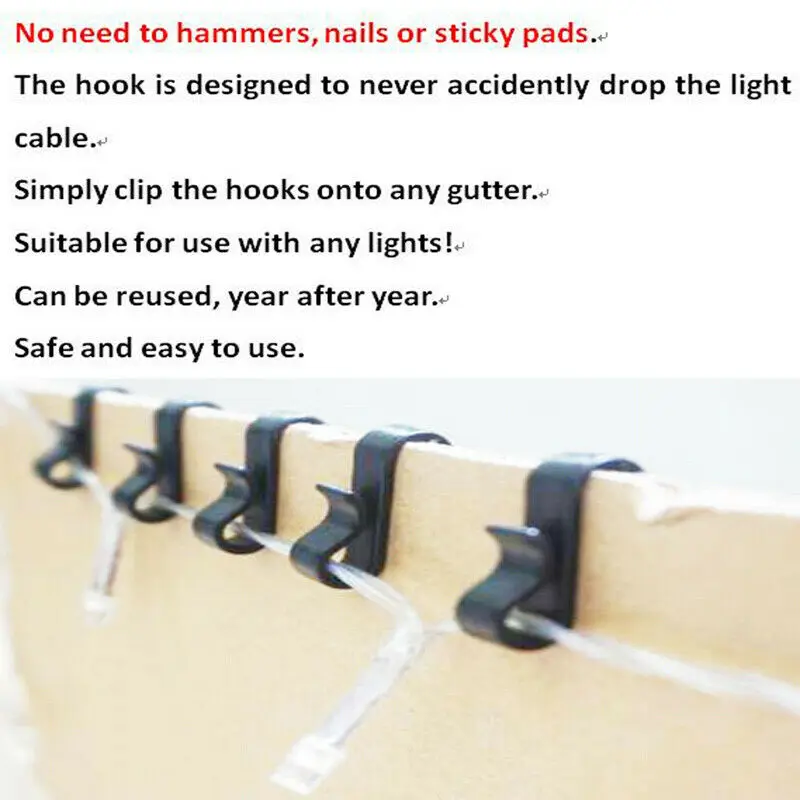 Спецификация: Абсолютно новый Тип: крюк для желоба Цвет: черный Материал: пластик Размер: 28*7,9*11,3 мм Соответствие единиц измерения: 1 см = 0,39 дюйма/1 дюйм = 2,54 см Не нужно молотки, ногти или липкие прокладки. Крючок предназначен для того, чтобы никогда случайно не уронить светильник. Просто закрепите крючки на любой желоб. Подходит для использования с любыми лампами! Можно использовать повторно, год за годом. Безопасный и простой в использовании. Посылка включает в себя: 100 шт. * Крючки для желоба