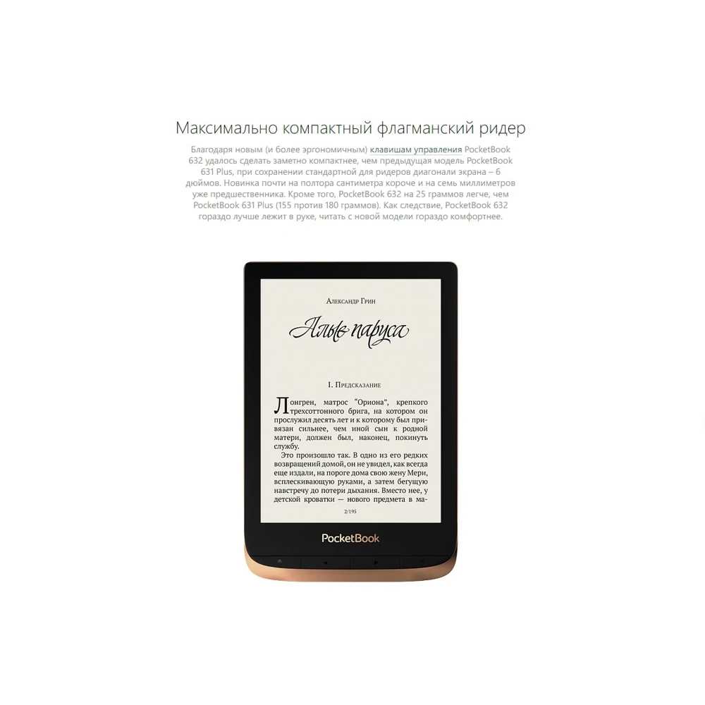 При этом PocketBook 632 заметно компактнее – ведь он выполнен в стандартном для ридеров 6-дюймовом формате