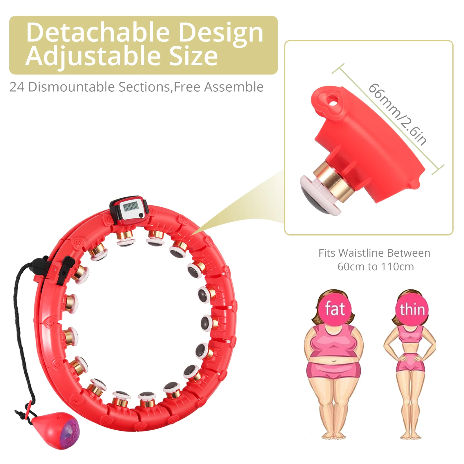 Этот продукт может помочь в упражнениях и улучшить вашу фигуру. 24 секции дизайна, каждая секция имеет массажный контакт, вы можете свободно сшить в соответствии с вашей талией, обруч ДЛЯ ФИТНЕССА имеет фиксирующую пряжку для легкой разборки и установки, он имеет центробежный шар, который может достичь того же эффекта, что и Обычный обруч ДЛЯ ФИТНЕССА. На гравитационном молотке есть цветные огни (нужно купить батарею). Встроенный счетчик в смарт-обруч ДЛЯ ФИТНЕССА может записывать ваши данные упражнений, автоматически выключается в течение 3 минут после остановки упражнений (светодиодный дисплей).