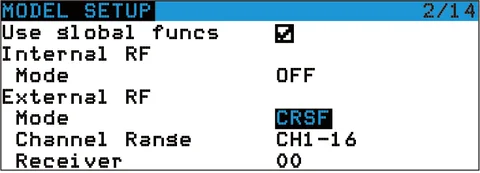 ExpressLRS использует последовательный протокол Crossfire (Протокол CRSF) для связи между радиопередатчиком и модулем Nano TX. Поэтому убедитесь, что ваш радиопередатчик Поддерживает последовательный протокол CRSF. Мы используем радиопередатчик с системой OpenTX, чтобы показать, как настроить Протокол CRSF и сценарий LUA. Чтобы настроить это, в системе OpenTX, введите в настройки модели, а на закладке «SETUP'' выключите «внутренний RF''. Затем включите ''внешний RF'' и выберите ''CRSF'' в качестве протокола.