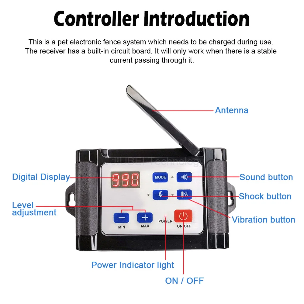 1. В тех случаях, когда "100/200/300/500/990» отображается на экране, это в беспроводном забор режим. Нажмите кнопку MODE, чтобы перейти в режим обучения собак, в режиме обучения собак, светодиодный дисплей «001», «002» или «003» означает для 1,2,3 собак. Функция отображения звука 1; Функция вибрации и удара 1-2-3 уровня может регулировать различные сильные стороны.