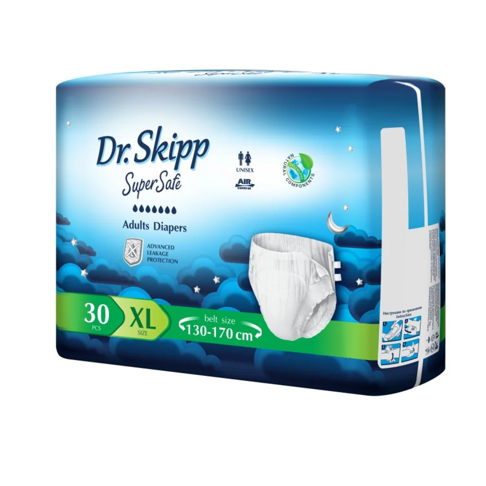 Подгузники Dr.Skipp Super Safe идеально подойдут для людей со средней и тяжелой степенью недержания, а также для лежачих больных. Двойной впитывающий слой гарантирует надежное удержание большого количества влаги и блокирует неприятные запахи, а дышащий внешний слой помогает избежать опрелостей.