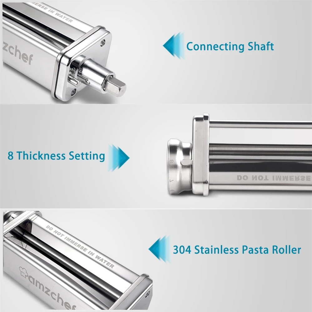 > Основные моменты 1. Умный выборЭтот Amzchef прокатки и режущий инструмент 3 в 1 комплект подходит идеально со всеми KitchenAid смесители стойки. Ролик для пасты набор аксессуаров включает в себя паста лист ролика, нож для спагетти и феттуксин резак.