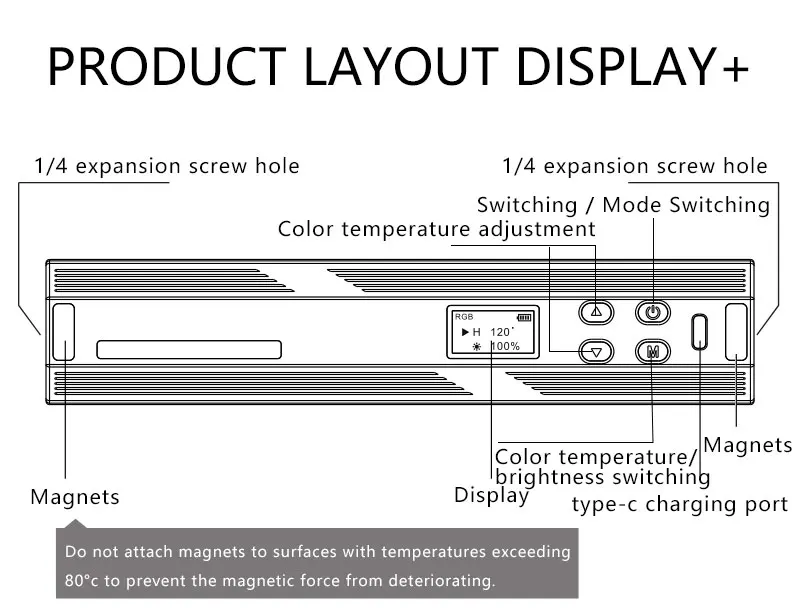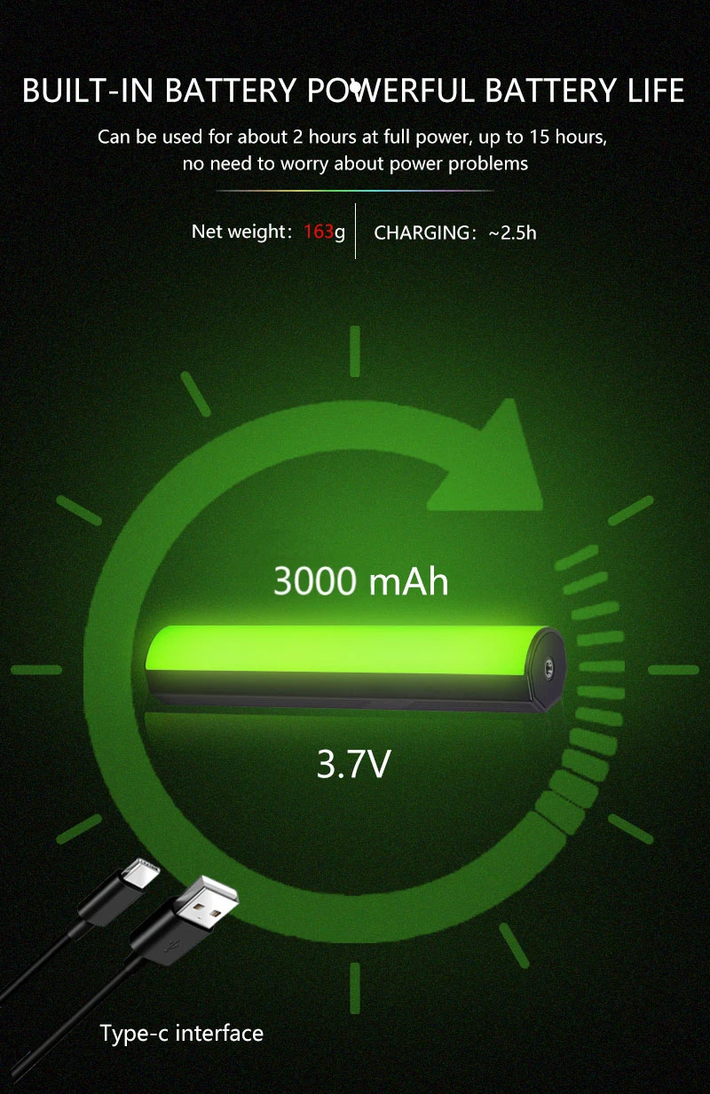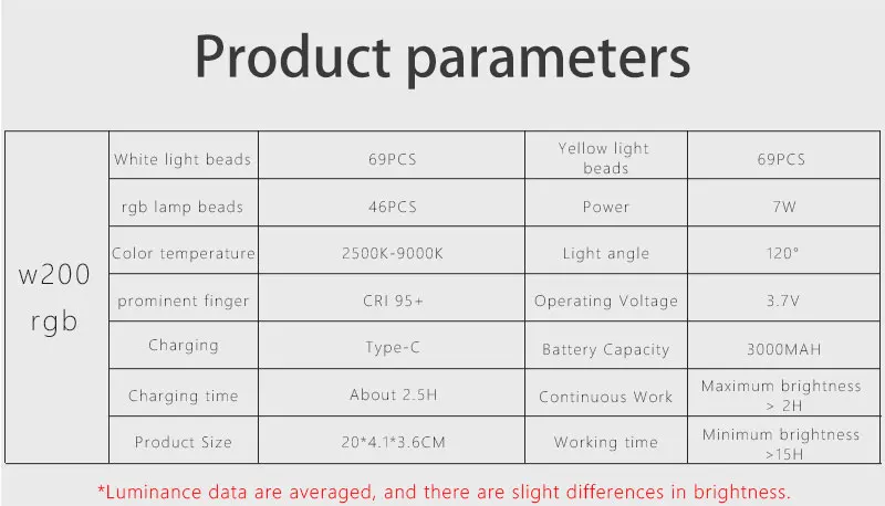 Непрерывное время работы: максимальная яркость> 2h, минимальная Яркость> 15h (данные о яркости являются средними данными, будут небольшие различия в яркости)