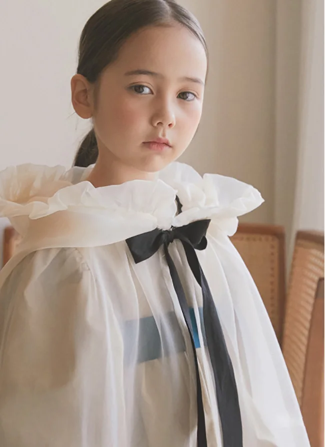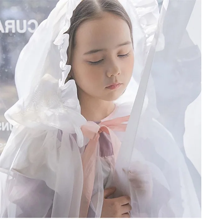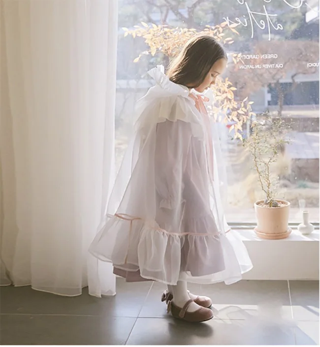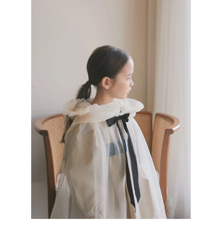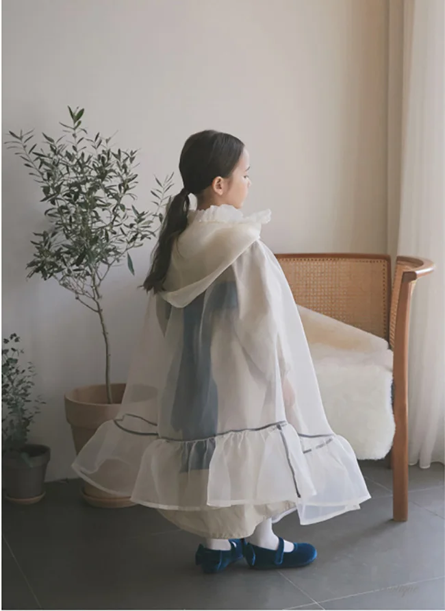Kid Girl White Organza Bow Cloak.Vintage Toddler Kids Ruffles Cape Transparent Princess Poncho Hooded Cloaks.Children’s Clothing