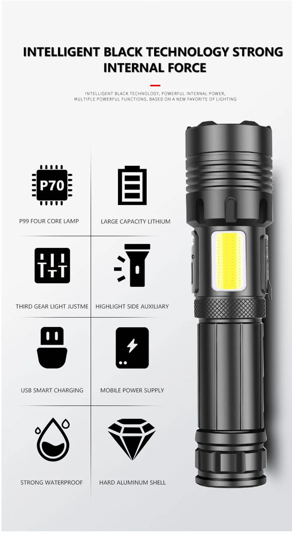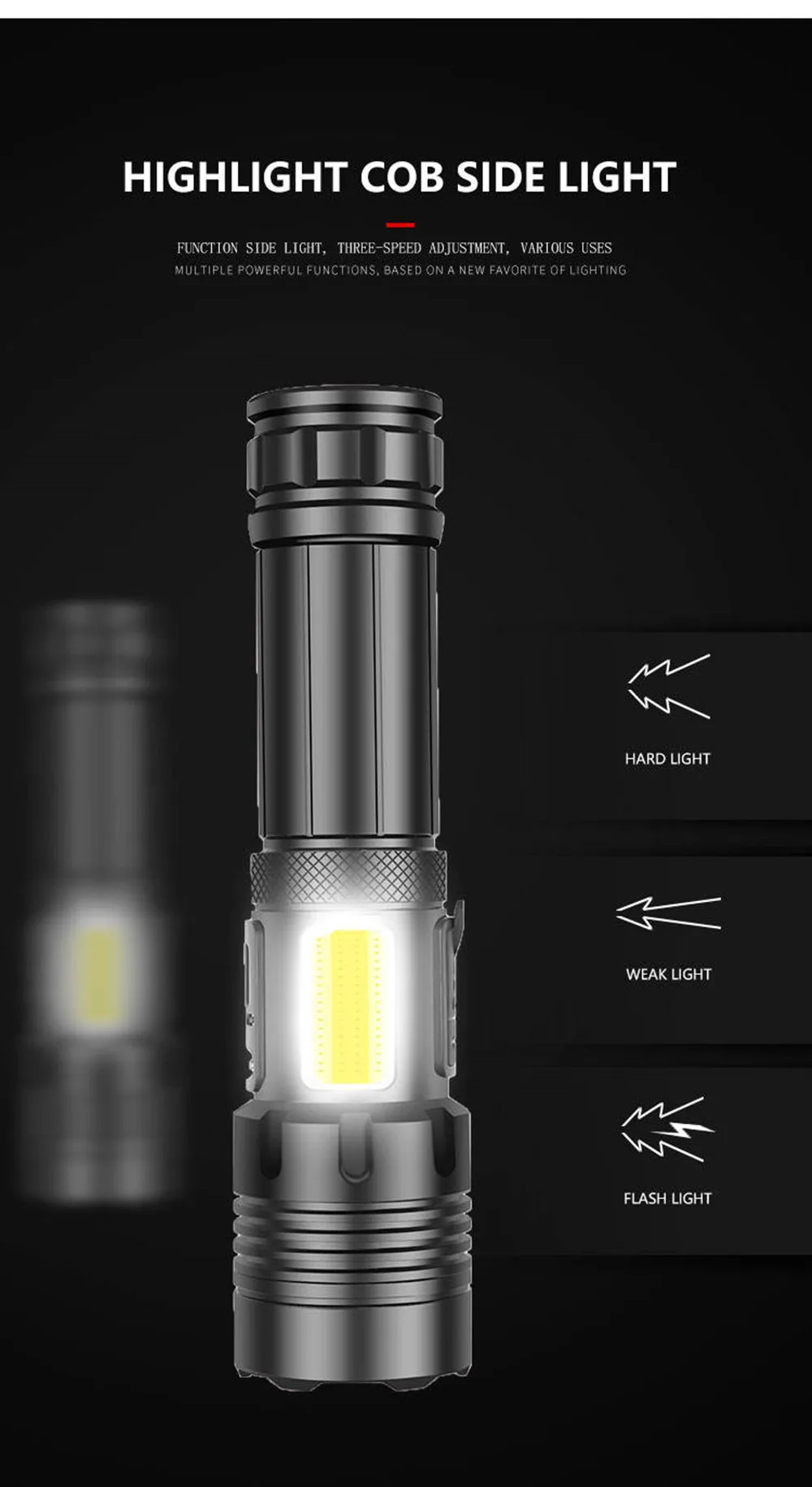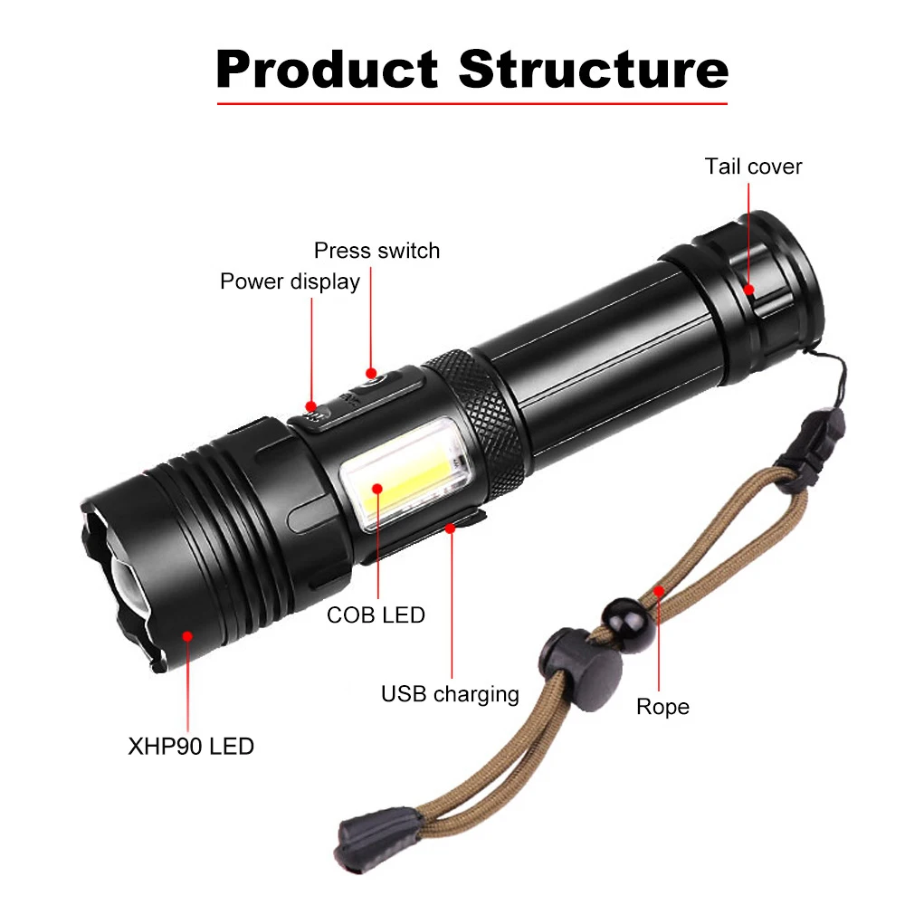 Посылка B:1 фонарик XHP90, 1 перезаряжаемый аккумулятор 26650, 1 пластиковая трубка 18650, 1 usb-кабель, 1 ремешок