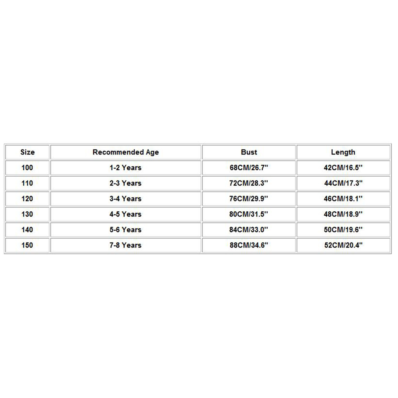 | Size | Recommended Age | Bust | Length |