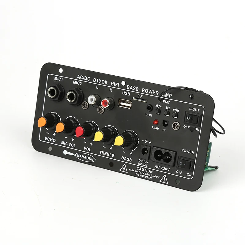 6, Двойной вход микрофона, регулируемый реверберации; Встроенный беспроводной приемник Bluetooth и fm-радио.