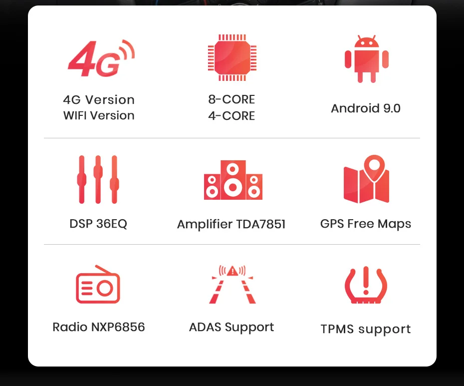 > 10 дюймов 2.5D емкостный Экран + 4 ядра 1,2 ГГц Процессор + DDR3 1 ГБ/2 ГБ/4 ГБ флэш-памяти (опционально) + 16 Гб/32 ГБ/64 Гб памяти (опционально) + встроенный Wifi (4G сеть опционально) + gps-навигация (Бесплатное обновление карты) + управление рулевым колесом + зеркальная связь + Bluetooth + Встроенный микрофон + FM/AM + RDS + Поддержка USB DVR ADAS + Поддержка Европейской DAB функции + 1080P видео воспроизведение + HD 1024*600 + Поддержка контроля давления в шинах Системы