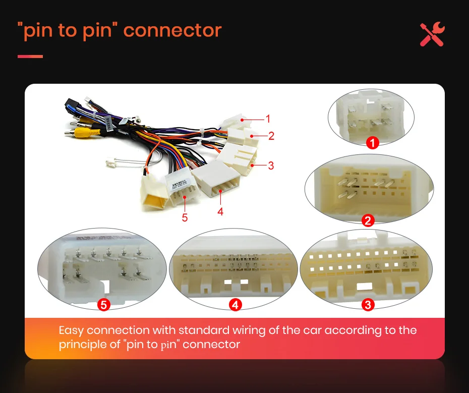 3) кабель для обнаружения заднего хода ④ (коричневый цвет) подключен к красному кабелю ③, который удлиняется от входного кабеля видео;